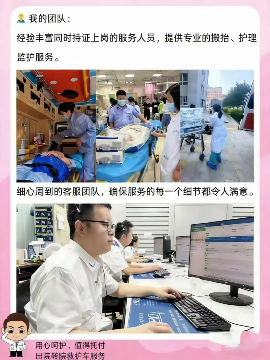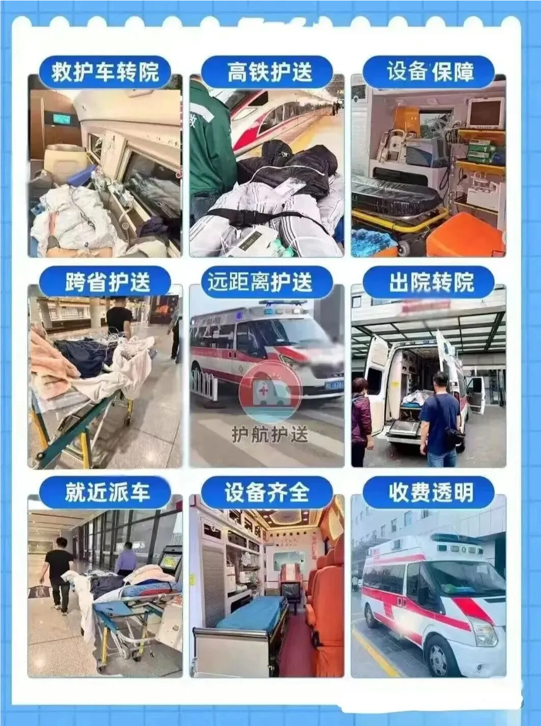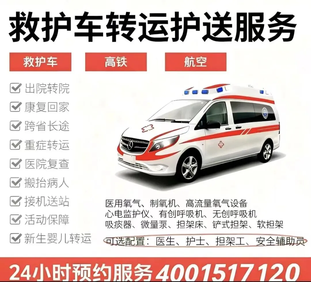 “我们是救护车出租转运公司,120救护车接送病人预约护送。24小时为术后康复、危重患者及跨区域就医人群提供专业医疗转运服务,提供120救护车出租‖救护车转运‖120救护车(非急救)‖跨省长途转运‖危重病人转运‖市内转运‖术后康复病人转运‖高铁病人转运‖患者返乡‖大型活动赛事保障‖配备ICU设备:呼吸机 · 心电监护仪 · 吸痰器 · 微量泵 · 氧气 · 急救药箱 · 专业医护团