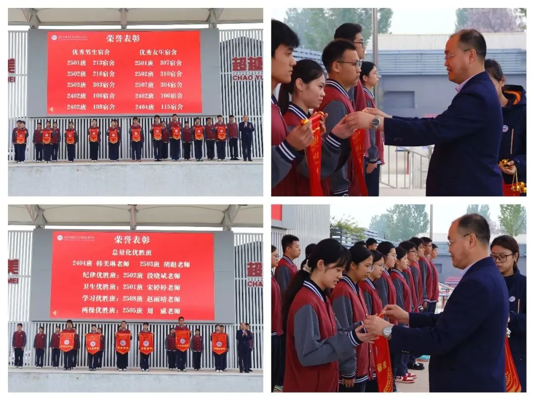 仪式之上,学校对第五、六周优秀集体予以嘉勉表彰,依次公布优秀男女生宿舍、量化优胜、纪律优胜、卫生优胜、学习优胜、两操优胜班级,以榜样为灯,引领全体同学见贤思齐、笃行争先。