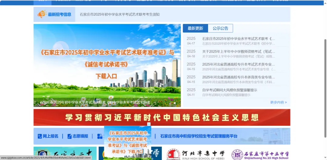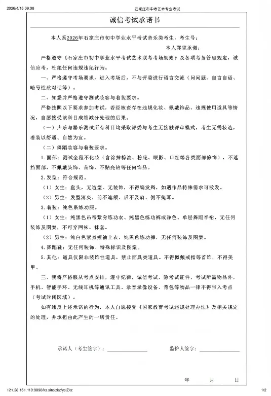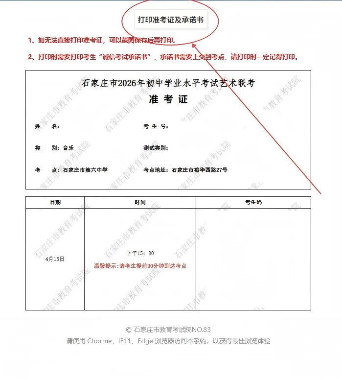 考生登录石家庄市教育考试院官网(http://www.sjzjyksxx.com.cn)下载打印《初中学业水平考试艺术联考准考证》和《诚信考试承诺书》。