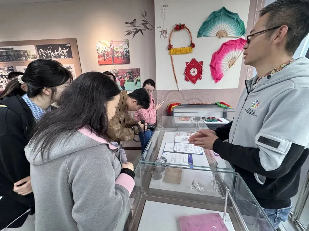 霸王鞭等传统拉花道具静静陈列,同学们驻足观看,近距离感受这些道具背后蕴含的文化寓意。