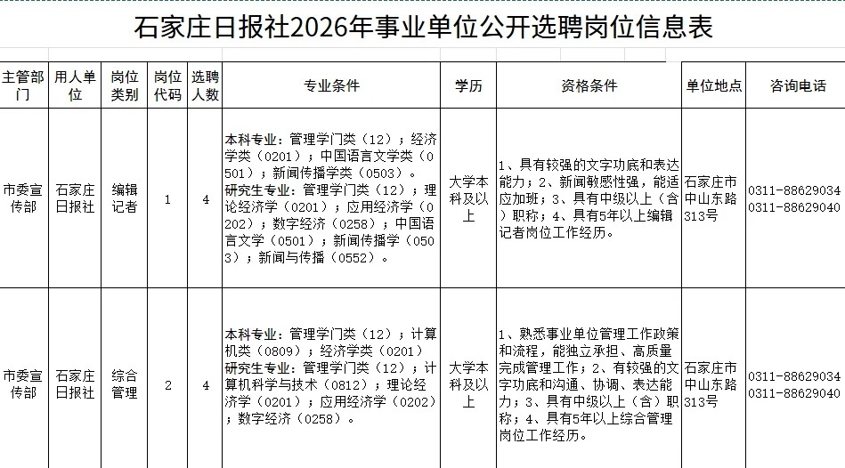 石家庄日报社2026年公开选聘事业单位工作人员公告