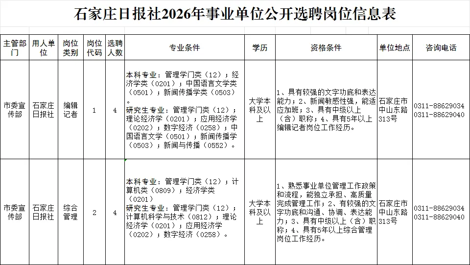 附件:石家庄日报社2026年事业单位公开选聘岗位信息表