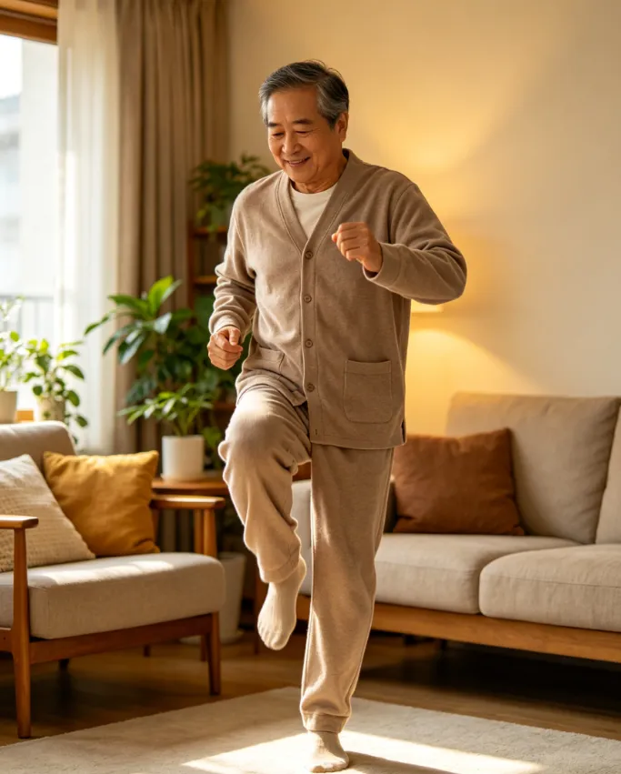 2. 动作二:踮脚踏步(站立姿势,双脚并拢,然后双脚交替踮起脚尖、落下,像踏步一样,每次做1分钟,休息10秒,一共做3组),这个动作不用弯腰、不用转身,简单易操作,能促进全身血液循环,增强腿部力量,改善下肢麻木、无力的情况,越踏越有劲儿,还能锻炼脚踝灵活性,预防摔倒;