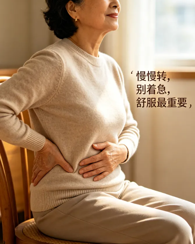 3. 动作三:坐姿转腰(坐在椅子上,双脚平放地面,双手轻轻扶在腰上,保持上半身挺直,然后慢慢向左侧转腰,停留2秒,再慢慢向右侧转腰,停留2秒,每侧做8次,每天做2组),这个动作特别适合久坐的家人,能放松腰部肌肉,改善久坐后的腰酸背痛、腰部僵硬,转一转超解压,还能促进腰部血液循环,保护腰椎;