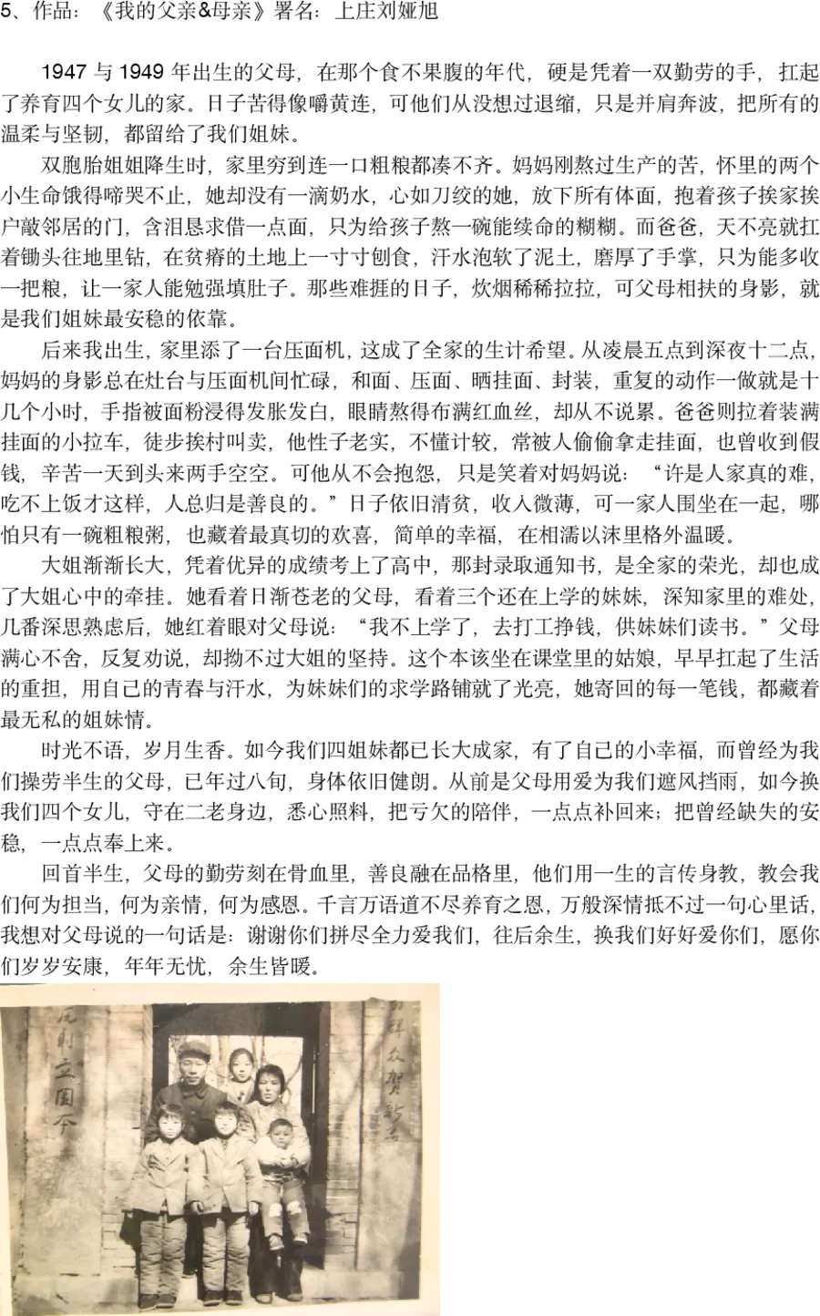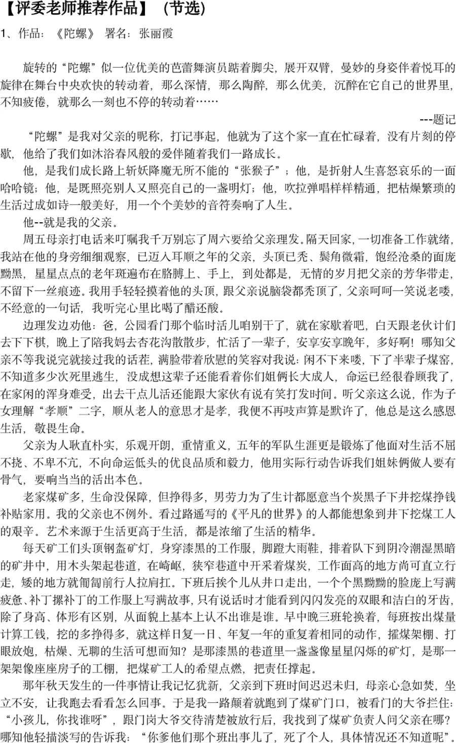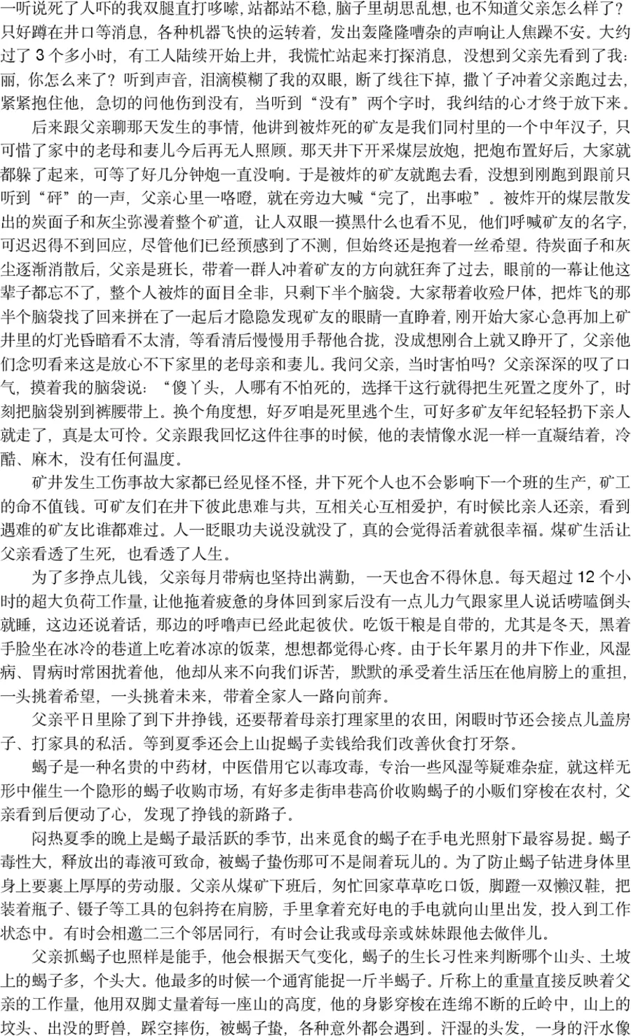 评委点评:这篇作品将父亲比作一只为家庭不停旋转的“陀螺”,意象精准而深刻。作者用极其细腻的笔触,还原了上世纪矿工家庭的艰辛与坚韧。父亲的沉默、勤劳、乐观,以及在生死面前的豁达,构成了一个平凡而伟大的中国父亲群像。文章不仅有动人的细节,更有时代的烙印,情感厚重,令人过目不忘。