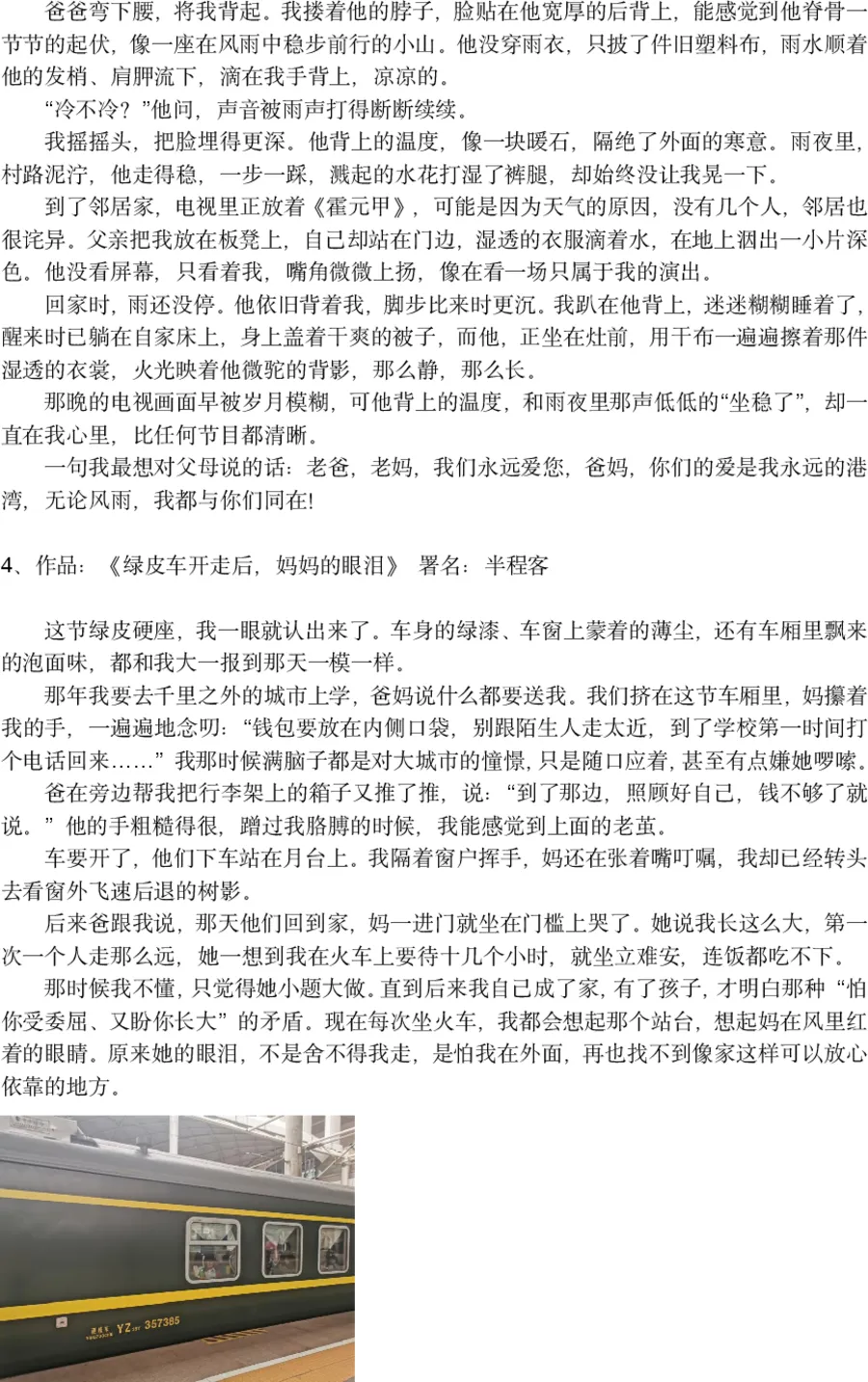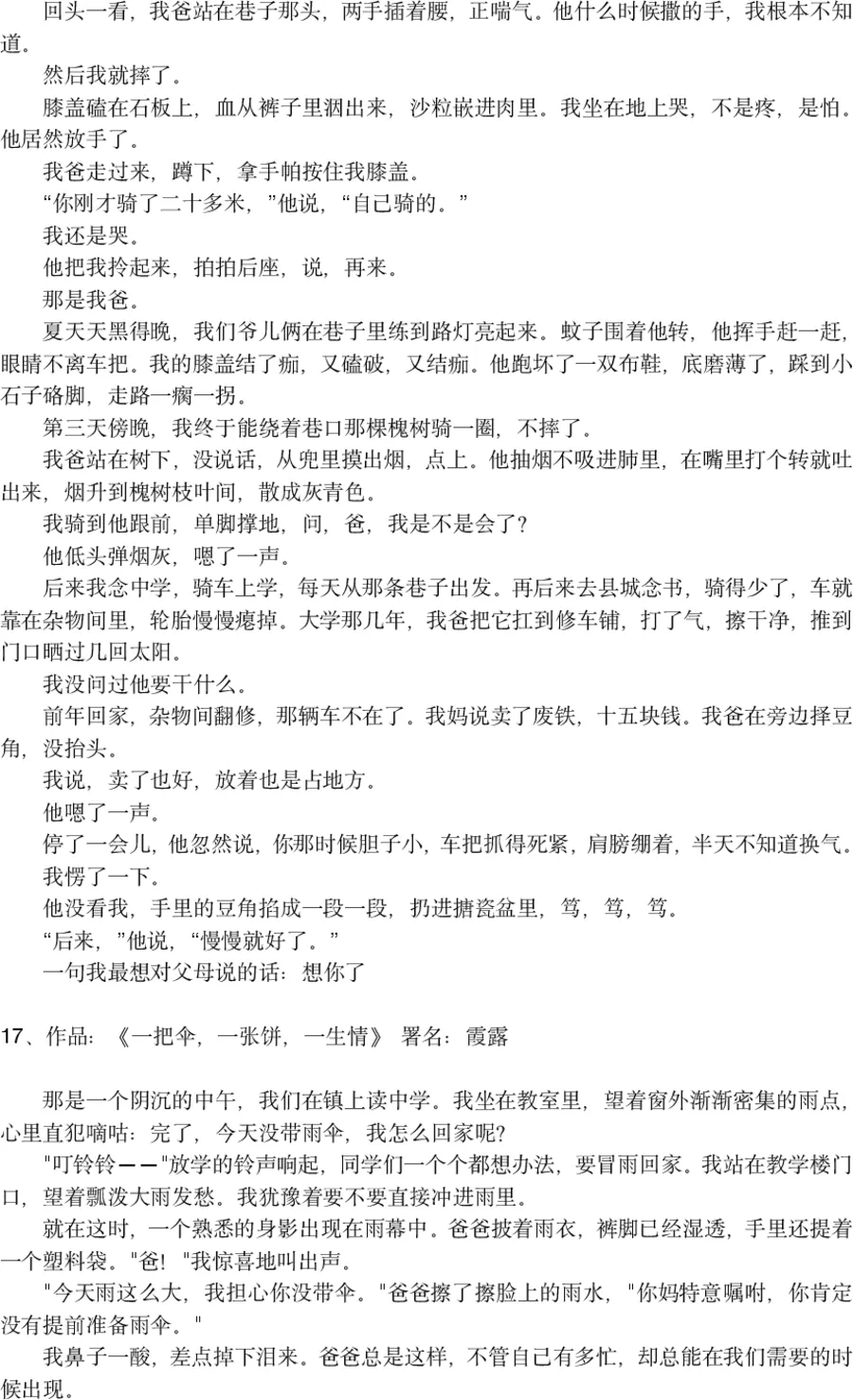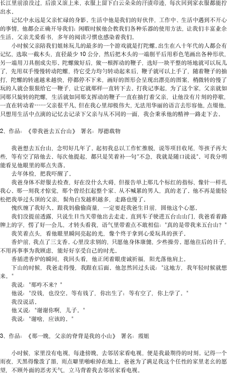 评委点评:这篇短文胜在画面感和情感冲击力。一个雨夜,一个想看《霍元甲》的孩子,一个二话不说背起孩子就走的父亲。父亲的脊背,就是孩子童年最安稳的山。文章细节丰富,“雨水顺着他发梢流下”,“湿透的衣服在地上洇出一小片深色”,让读者仿佛置身那个雨夜,感受到那份沉甸甸的父爱。