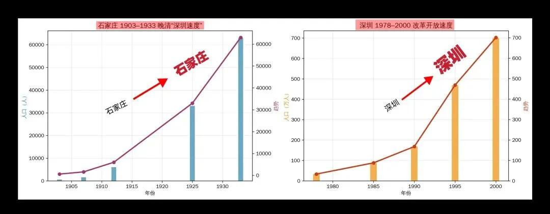 随着1905年总机厂开工,拉开了石家庄人口集聚与工业勃发的大幕,随着铁路枢纽成型,人口与产业随后进入快速增长通道。
