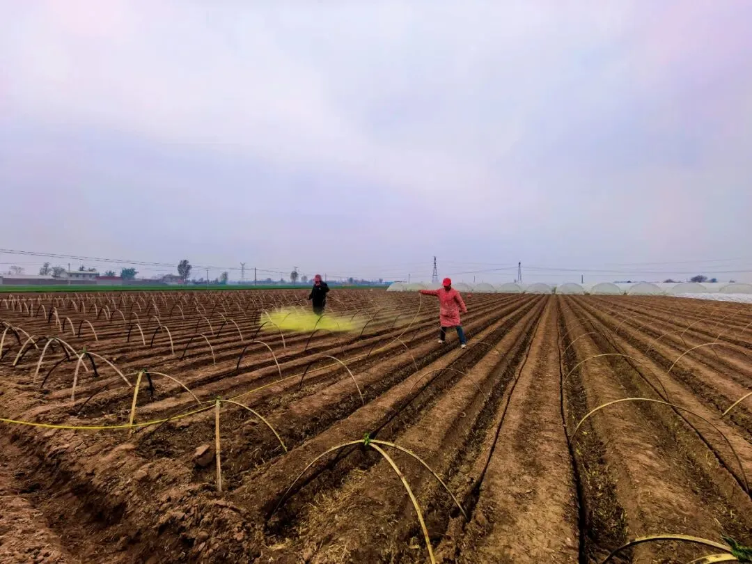 走进生姜种植基地,连片70亩规整姜垄错落排布、一望无垠,务工群众分工明确、干劲十足、配合默契,专人手持植保器械匀速行进,药液雾化均匀、落点精准,细致完成田间消杀与苗期防护。覆膜班组多人合作、协同作业,整套流程衔接紧凑、动作娴熟标准,一气呵成。