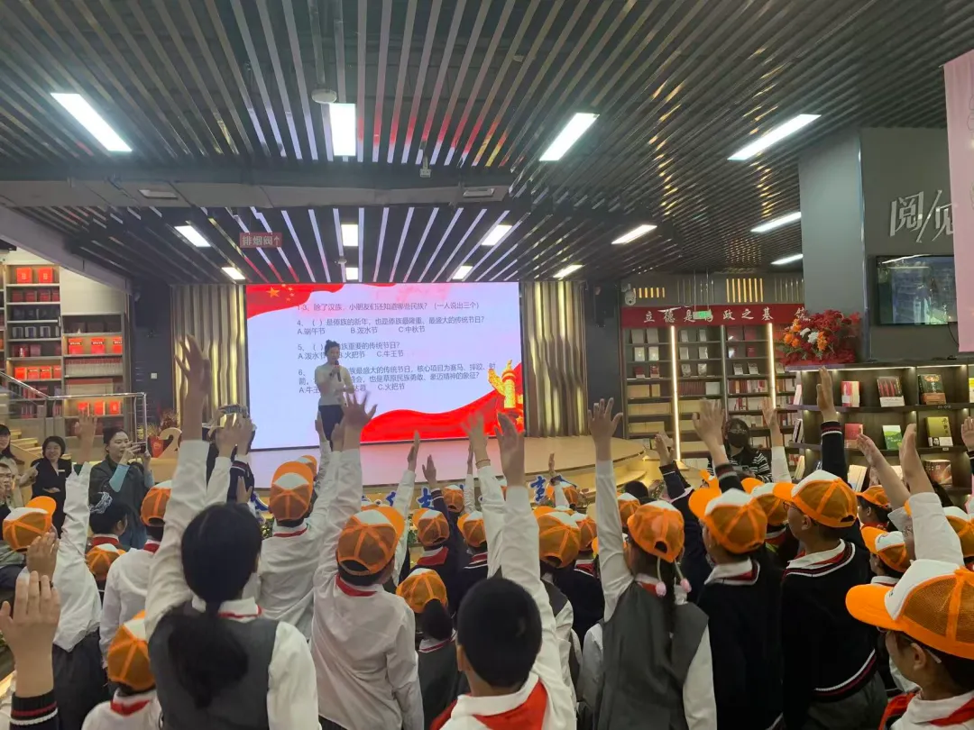 随后的知识抢答环节将气氛推向高潮,小手高高举起,抢答声此起彼伏,在趣味问答中加深对民族团结的理解,种下“中华民族一家亲”的种子。答题结束后,工作人员为每位同学发放专属书目条,开启寻宝之旅。