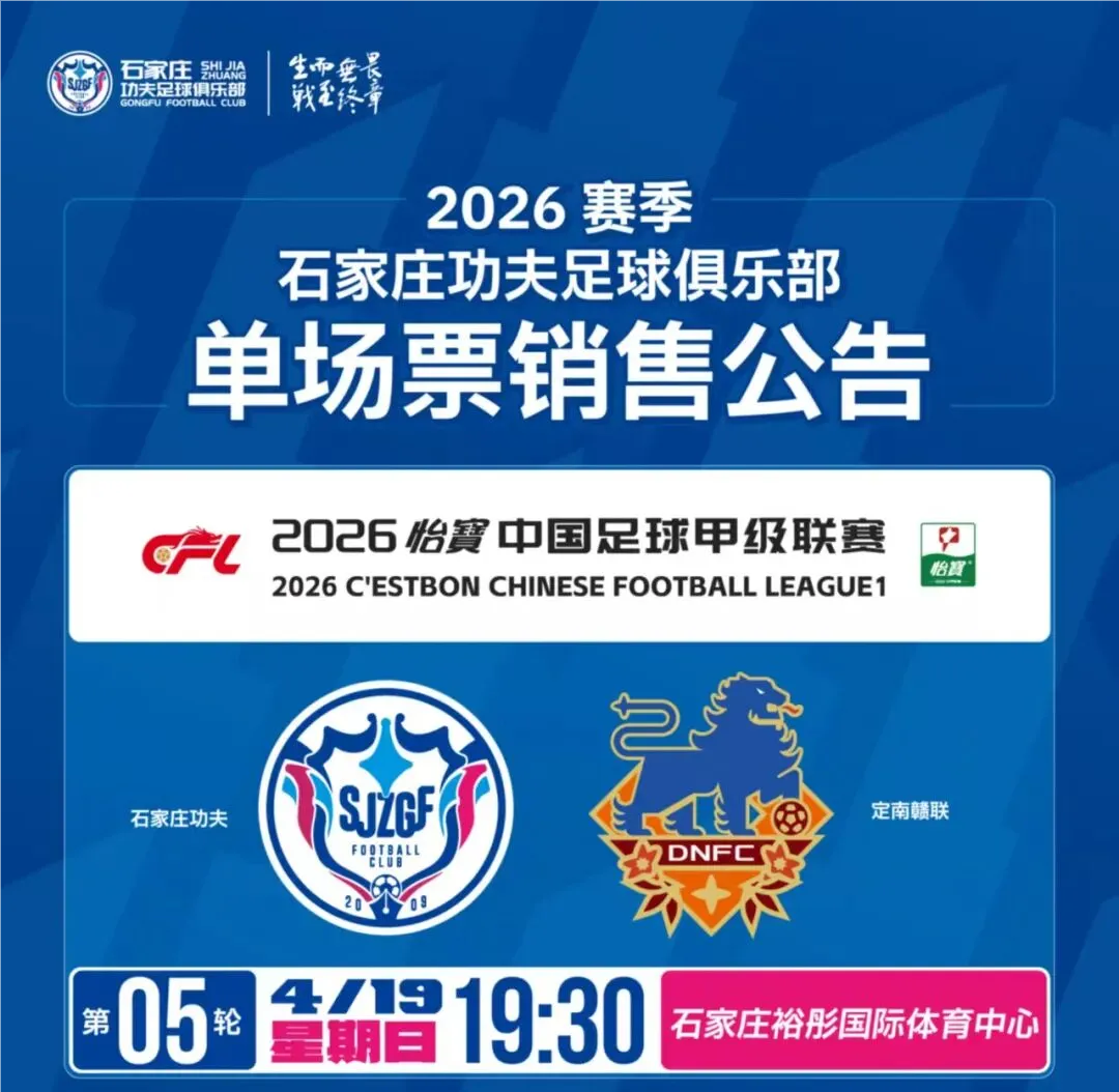 4月19日本周日19:30,石家庄功夫将在主场裕彤国际体育中心,迎战来访的定南赣联。本场比赛单场票于4月15日上午10:00开售,让我们一起重整旗鼓,为石家庄功夫加油!