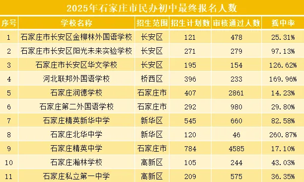 根据2025年石家庄市民办初中摇号报名情况,长安区有三所九年一贯制民办学校:金柳林外国语学校、阳光未来实验学校和华文学校。其中摇号计划最少、摇中难度最大的是金柳林外国语学校,招生计划121人、审核通过人数478人,摇中率仅有25%稳居长安第一。即使放眼整个市区来看,摇中率难度也是名列前茅,凸显了金柳林这所老牌外国语学校重启摇号的火爆流量。此外,该校小学部摇号命中率也是25%,小学部和初中部摇号节奏同频共振,长期积淀形成的办学优势领跑全市民办学校第一方阵。