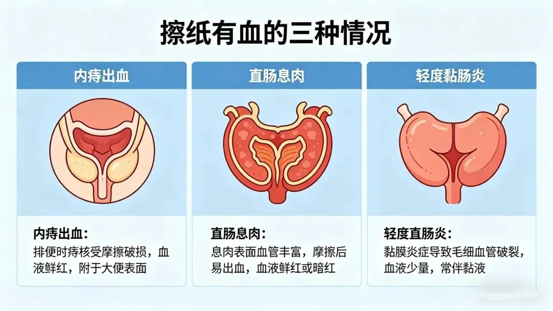 蹲完厕所擦纸见鲜血却无痛,是不是让你既尴尬又慌张?既不好意思就医,又担心是严重疾病。其实,无痛性擦纸出血,内痔最常见,但还有2种易被忽视的情况,今天一次性讲清,帮你自查应对,不慌不扛。