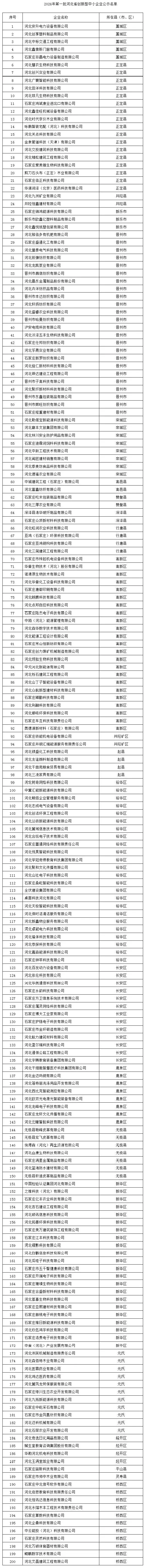 按照《河北省优质中小企业梯度培育管理细则》有关规定和河北省工业和信息化厅《关于开展2026年第一批河北省创新型中小企业申报和到期自评工作的通知》要求,我局组织了2026年第一批河北省创新型中小企业申报工作,经企业自评、申报,县(市、区)工信主管部门初审推荐,我局评审及现场抽查,拟推荐河北安升电力设备有限公司等200家企业为河北省创新型中小企业,现将名单予以公示。