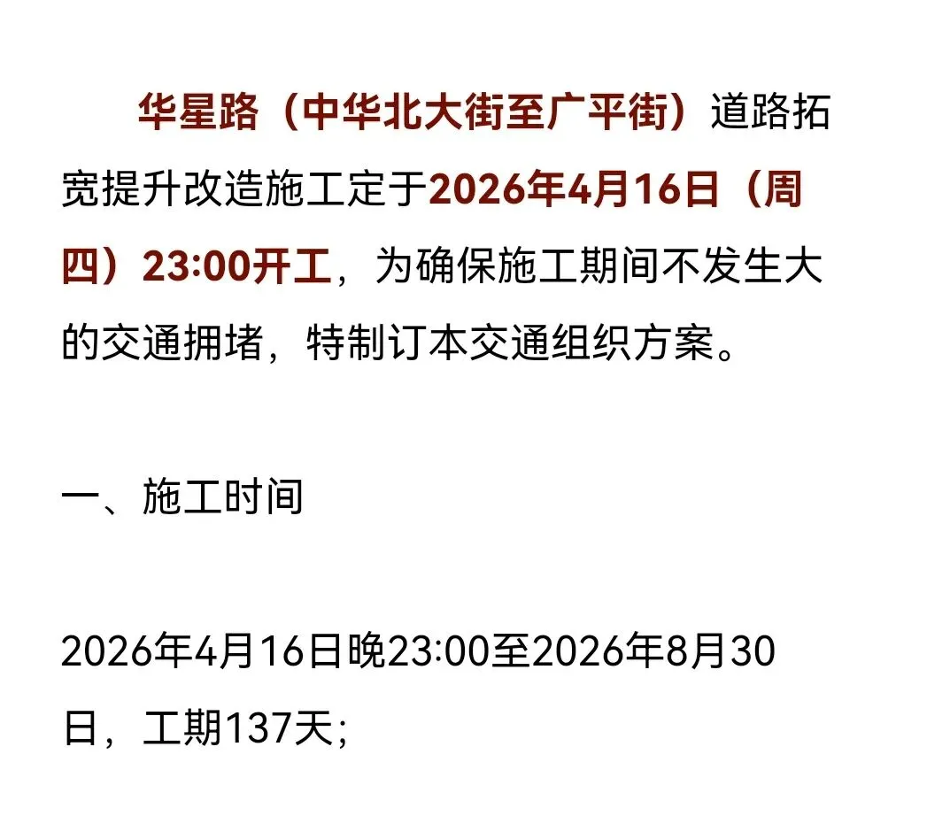 近日,石家庄交通部门信息,石家庄华星路(中华北大街至广平街)段道路拓宽提升改造施工启动,施工时间为2026年4月16日至2026年8月30日,工期137天。
