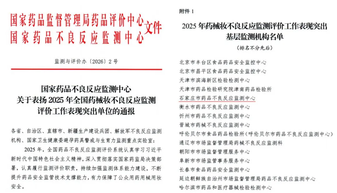 近日,国家药品监督管理局药品评价中心、国家药品不良反应监测中心联合印发通报,对2025年度全国药械妆不良反应监测评价工作表现突出的单位予以表彰。其中,石家庄市药品不良反应监测中心凭借扎实的工作成效,荣获“2025年药械妆不良反应监测评价工作表现突出基层监测机构”称号。