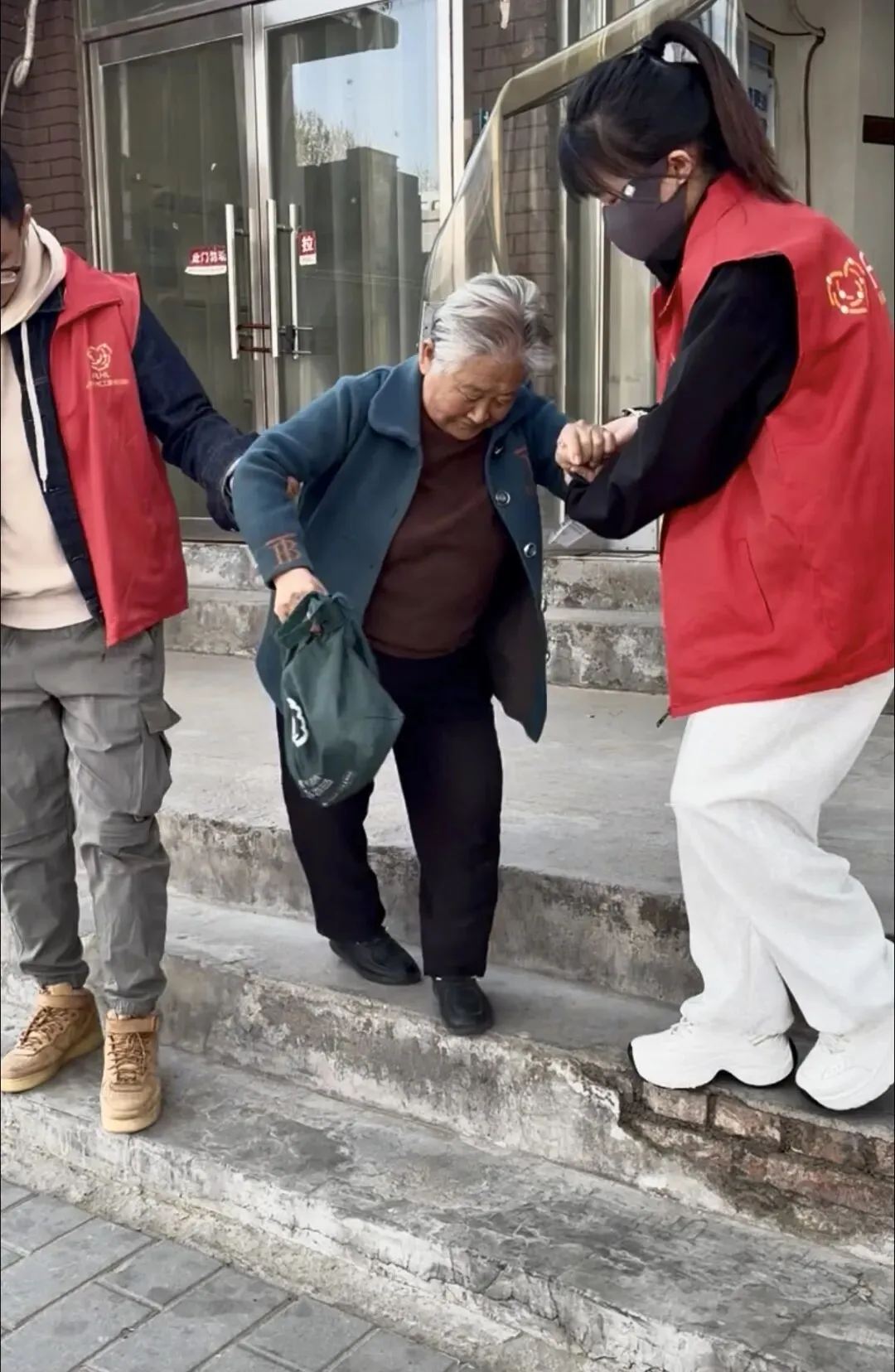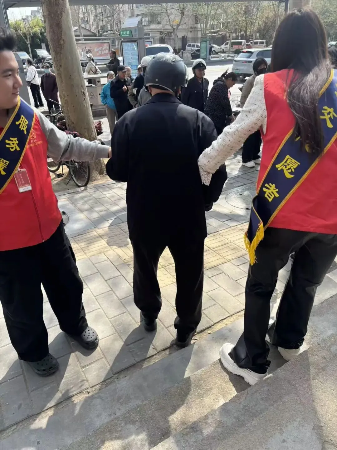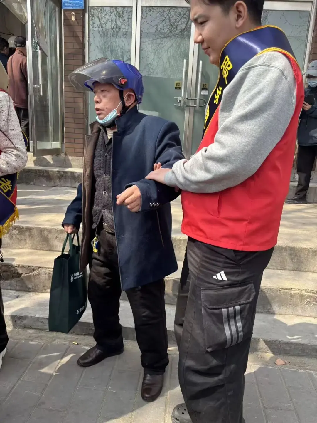 前来办理业务的多是年长的老人,不少人腿脚不便、行动迟缓,服务网点前的几级台阶,成了他们前行路上需要格外小心的“阻碍”。但在这里,这样的“阻碍”总能被社工们的善意悄悄化解。每当看到老人缓步走近,身着红色志愿马甲的社工们总会第一时间上前,轻轻扶住老人的手臂,放慢脚步陪着老人一步步踏上台阶,耐心叮嘱“慢一点,小心脚下”,细致护送老人抵达办理窗口。遇到需要特殊照料的老人,社工们还会主动帮着拎包、引导,让老人在办理业务的过程中全程安心。