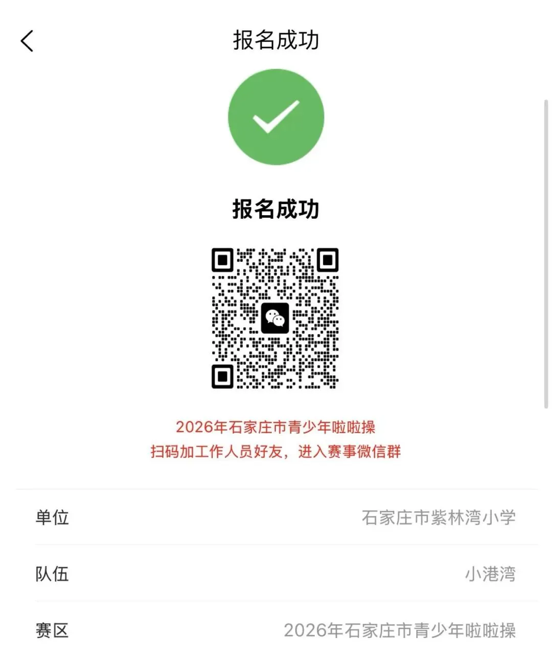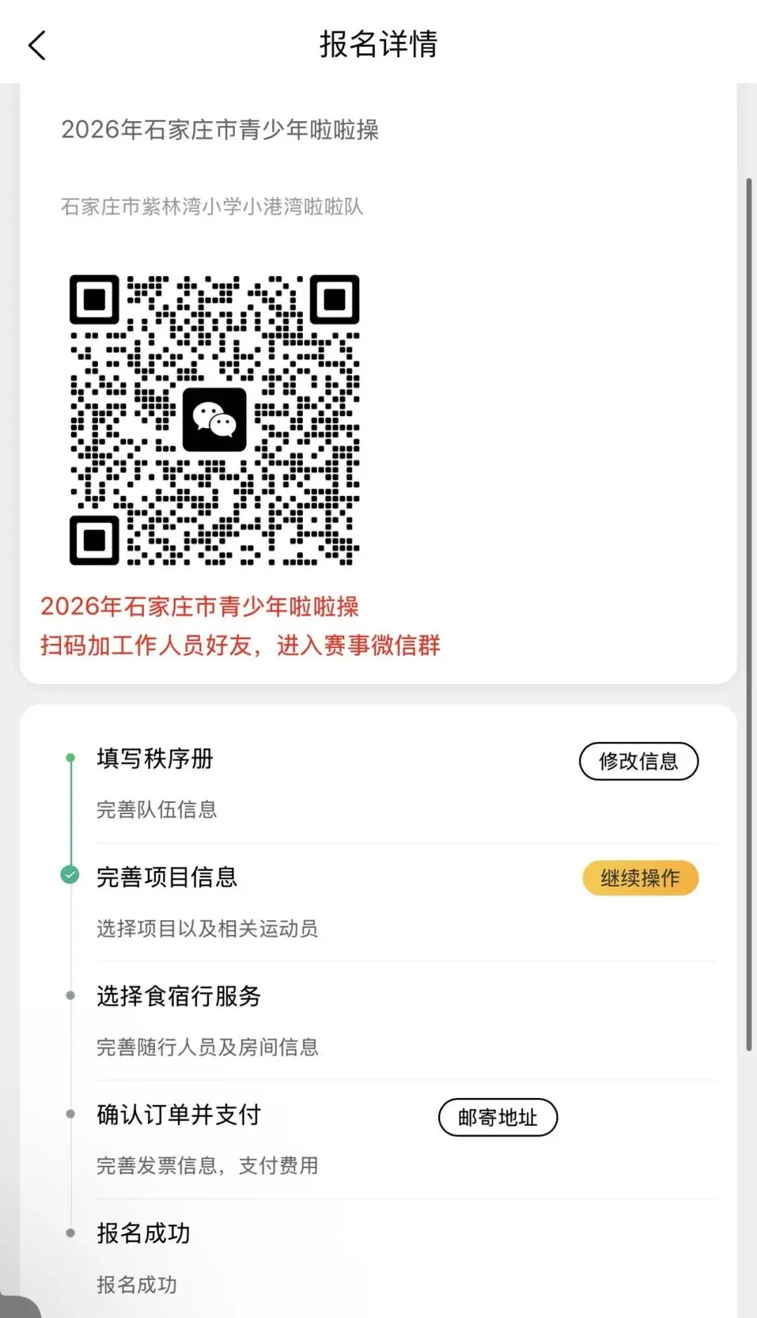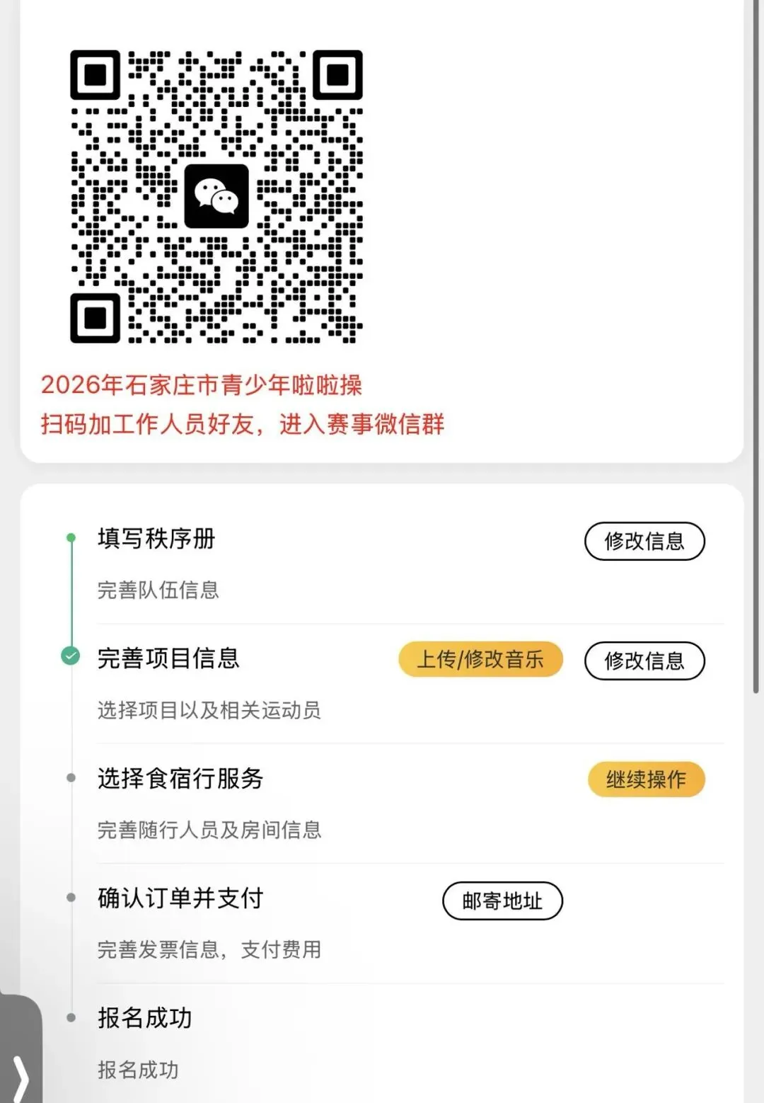 第一步:打开啦啦操GO,打开“2026年石家庄市青少年啦啦操比赛”点击报名第二步:没有进行单位认证“请点击进行单位认证或绑定”第三步:已有绑定单位“请点击去绑定”没有注册单位“请点击备案”第五步:如要出席裁判员“请在随队裁判中进行选择”,如要出席教练员“请在教练员中进行选择”第六步:如需发票的单位“请按照以下信息填写”,不需要的单位“请在以下信息中填写无”并点击下一步第八步:点击新增项目,“点击项目选择运动员符合年龄组别,添加参赛运动员、替补运动员以及教练员”(只参加一项的单位填写信息后并点击保存,参加多项的单位点击新增项目填写信息,以此类推,填写完成后点击保存并选择“我没有项目要报了”)(需要食宿行的单位,输入并确定领队、运动员、教练员、随行人员数量“并点击保存并选择食宿”进行缴费并选择确认提交,“不需要的单位请点击不要食宿”)第十步:报名成功后长按二维码图片或截图保存至相册➡打开微信➡点击右上角“+”号➡点击“扫一扫”➡点击“相册”➡选中对应图片➡进入2026年石家庄市青少年啦啦操群聊大家点击下方图片关注石家庄市啦啦操协会二维码,后期赛事活动等将以本公众号发布。