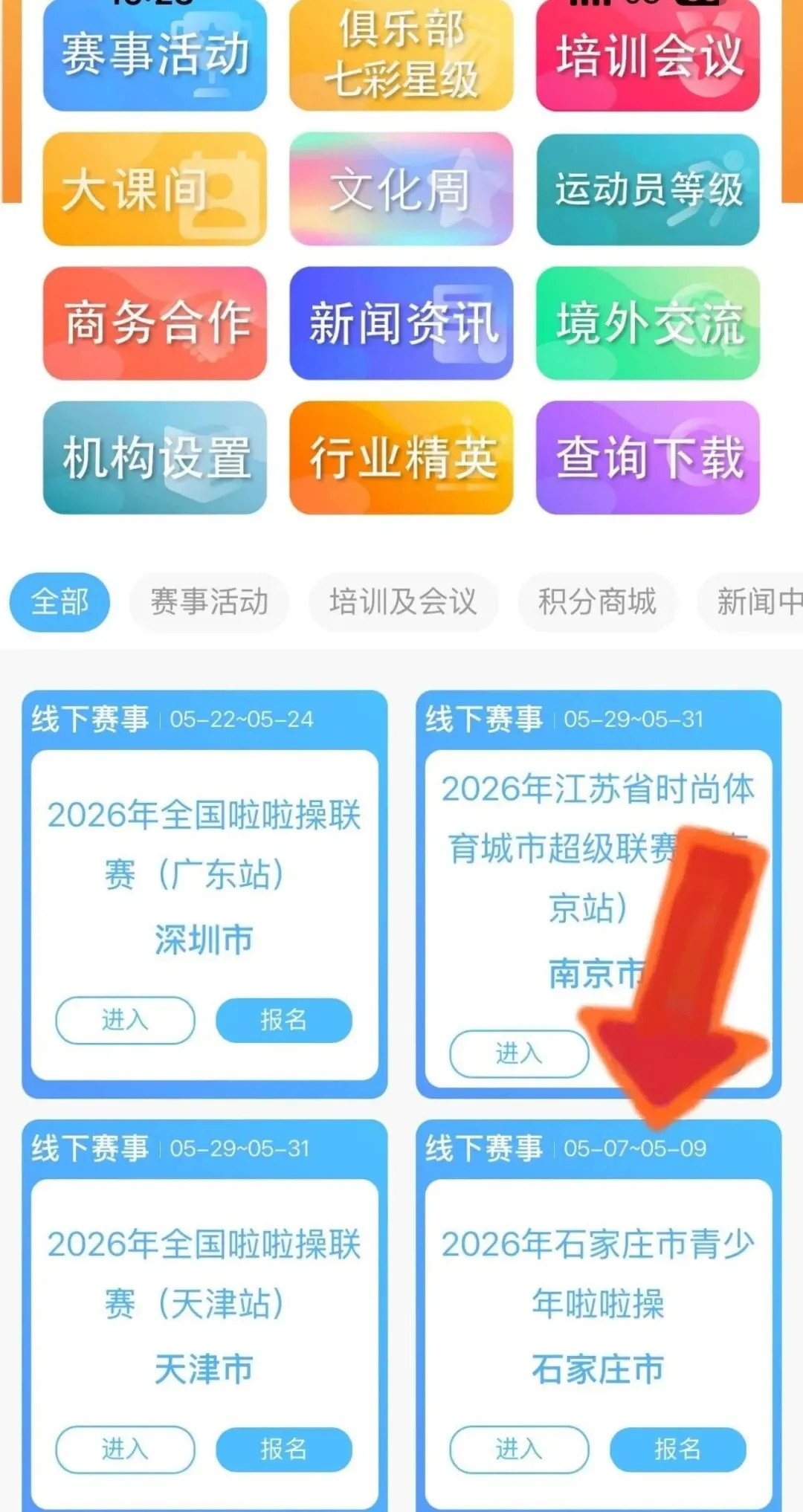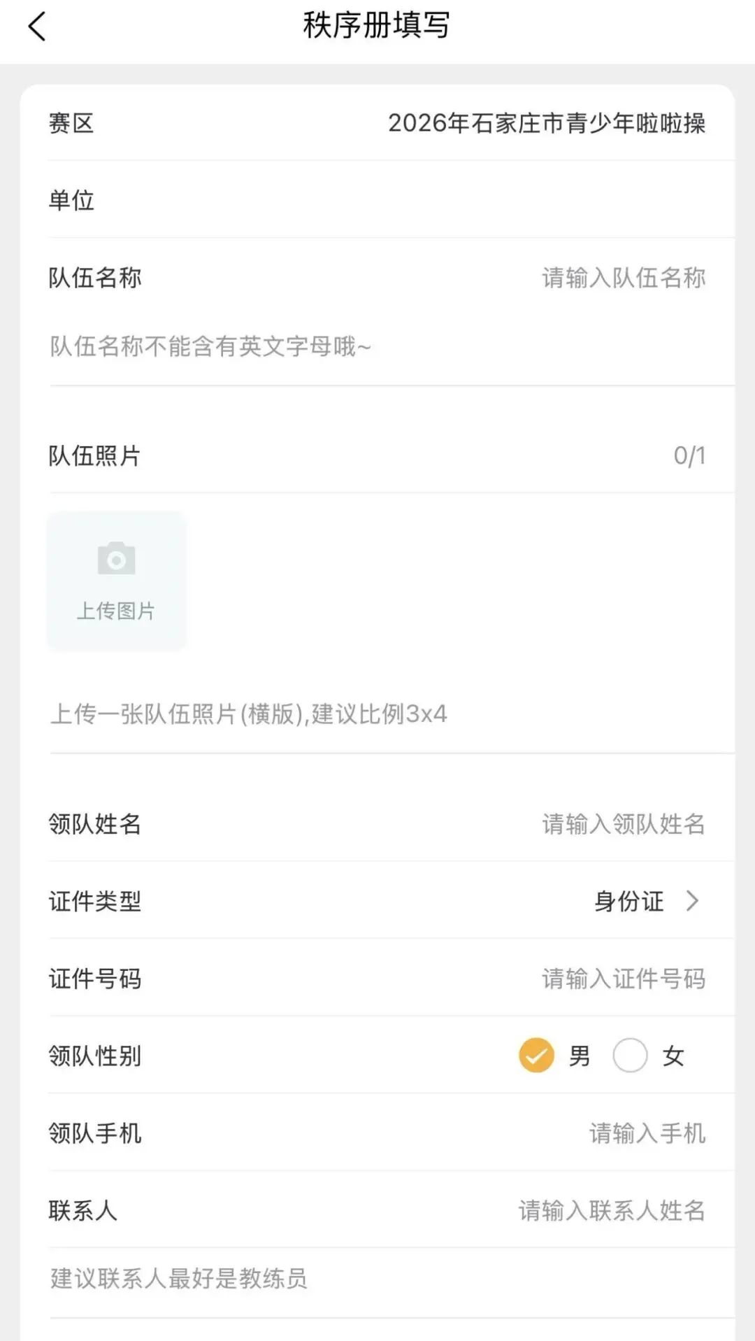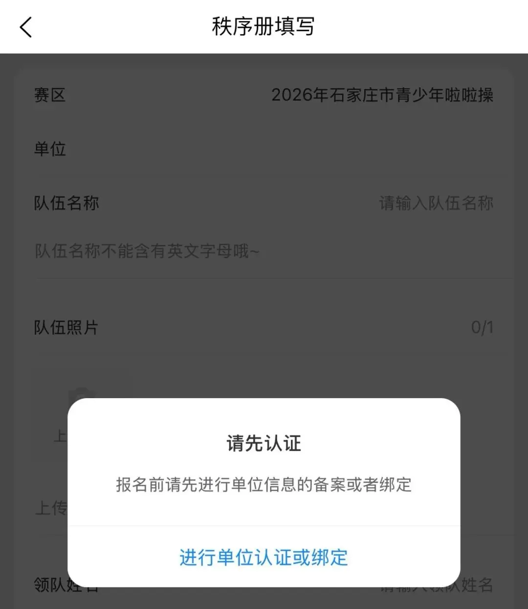 第一步:打开啦啦操GO,打开“2026年石家庄市青少年啦啦操比赛”点击报名第二步:没有进行单位认证“请点击进行单位认证或绑定”第三步:已有绑定单位“请点击去绑定”没有注册单位“请点击备案”第五步:如要出席裁判员“请在随队裁判中进行选择”,如要出席教练员“请在教练员中进行选择”第六步:如需发票的单位“请按照以下信息填写”,不需要的单位“请在以下信息中填写无”并点击下一步第八步:点击新增项目,“点击项目选择运动员符合年龄组别,添加参赛运动员、替补运动员以及教练员”(只参加一项的单位填写信息后并点击保存,参加多项的单位点击新增项目填写信息,以此类推,填写完成后点击保存并选择“我没有项目要报了”)(需要食宿行的单位,输入并确定领队、运动员、教练员、随行人员数量“并点击保存并选择食宿”进行缴费并选择确认提交,“不需要的单位请点击不要食宿”)第十步:报名成功后长按二维码图片或截图保存至相册➡打开微信➡点击右上角“+”号➡点击“扫一扫”➡点击“相册”➡选中对应图片➡进入2026年石家庄市青少年啦啦操群聊大家点击下方图片关注石家庄市啦啦操协会二维码,后期赛事活动等将以本公众号发布。