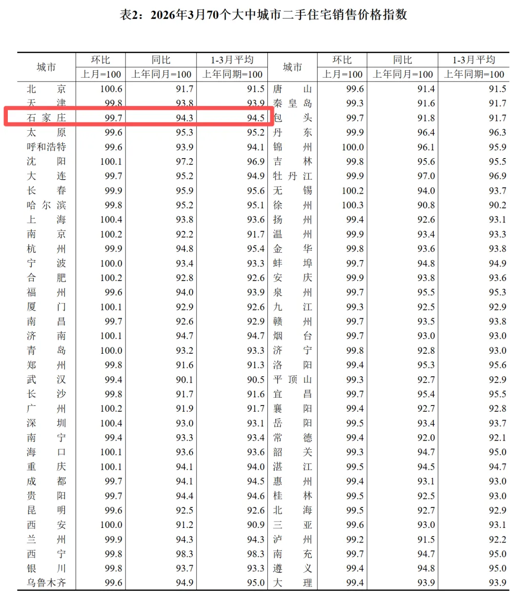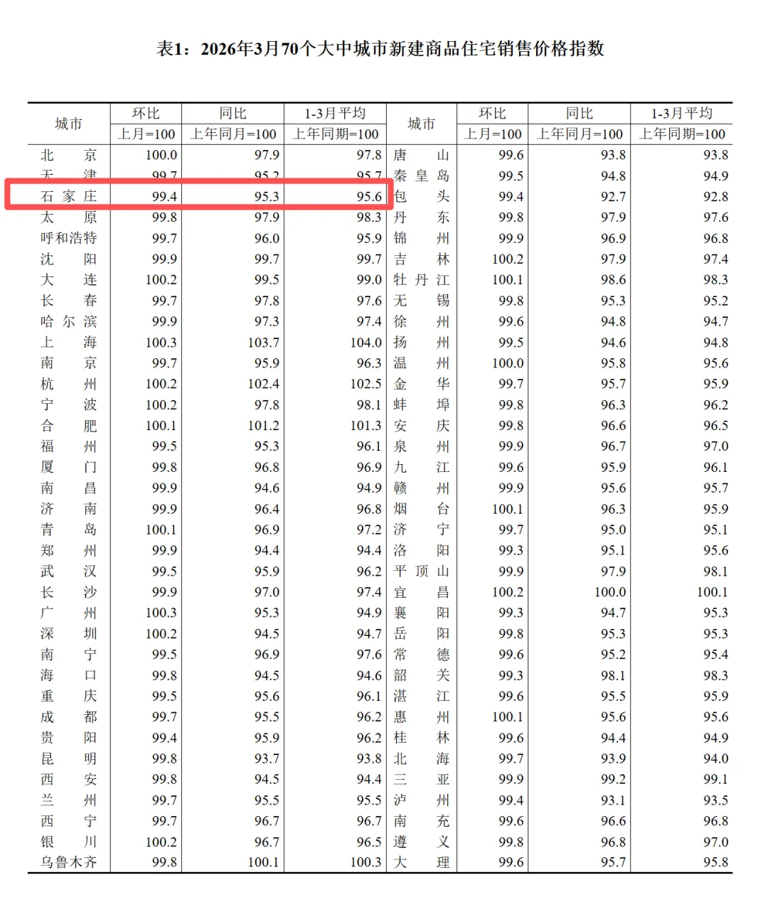 4月16日国家统计局发布70个大中城市商品住宅销售价格变动情况,2026年3月份,70个大中城市中,一线城市商品住宅销售价格环比上涨,二三线城市环比降幅收窄或相同。新建商品住宅和二手住宅销售价格环比上涨城市个数均比上月增加。其中石家庄,3月新房价格环比下降0.6%,同比下降4.7%;二手房价格环比下降0.3%,同比下降5.7%。一、一线城市商品住宅销售价格环比上涨,二三线城市环比降幅收窄或相同