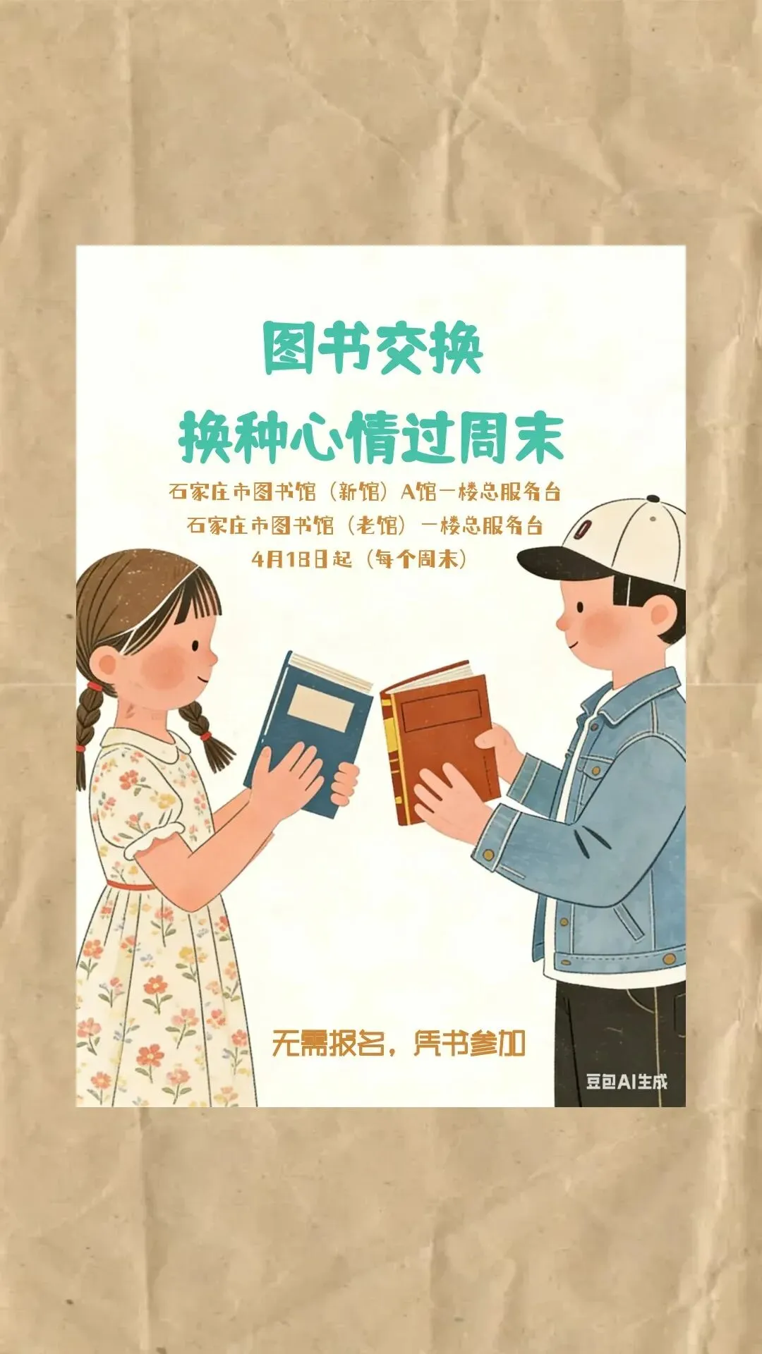 ① 带上家中闲置正版好书赴约(教辅和杂志除外),图书内容应积极健康,适宜大众传播。图书品相好,无脏污、破损,不影响再次阅读,具有交换价值。