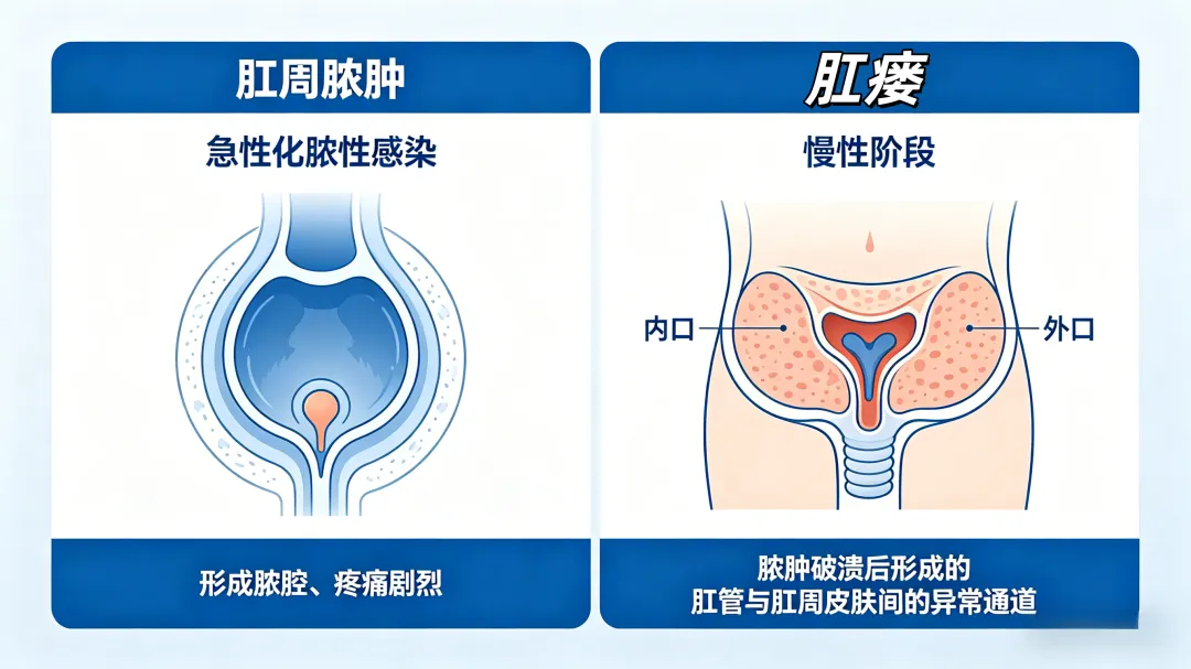 要懂根治可能性,先理清两者关系:肛周脓肿是肛管直肠周围急性化脓性感染,形成脓腔、疼痛剧烈;肛瘘是脓肿破溃后形成的肛管与肛周皮肤间的异常通道,有内、外口,属慢性阶段。多数肛瘘由脓肿处理不当或自行破溃演变而来,二者同源,因此肛周脓肿手术的核心,是处理好肛瘘的根源——内口,阻断其发生。