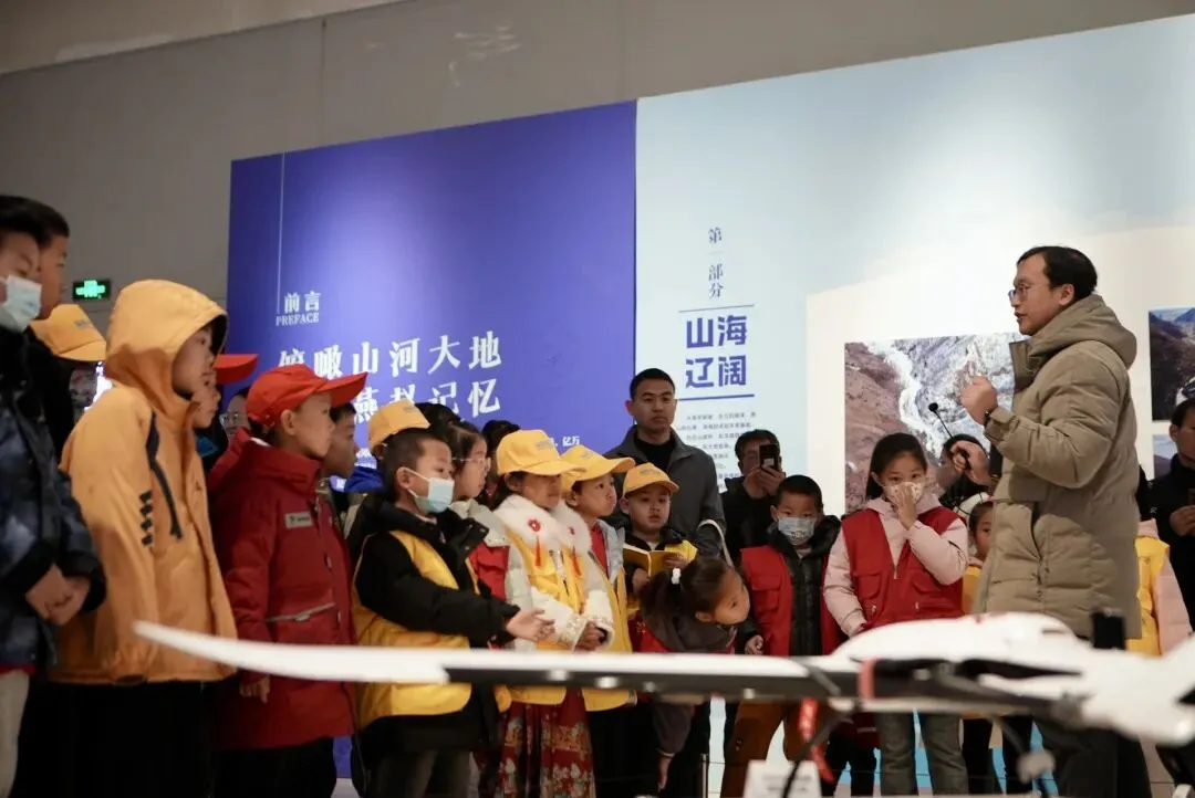 移步“地质人瞰河北”航拍摄影展区,浩瀚渤海的壮阔、白洋淀的浩渺波光、太行山脉的苍茫险峻,通过航拍镜头一一呈现。小记者们纷纷举手提问:“这些照片是用什么无人机拍的呀?”“地质队员是怎么保护这些山川的?”讲解员耐心解答,现场介绍了应急救援无人机、飞马V10垂直起降固定翼无人机等“黑科技”装备,让大家直观了解到科技在地质工作中的应用。一位小记者一边认真记录,一边忍不住感叹,随着讲解员的讲解,仿佛穿越时空,感受到了地质人勘探山河的艰辛与执着。