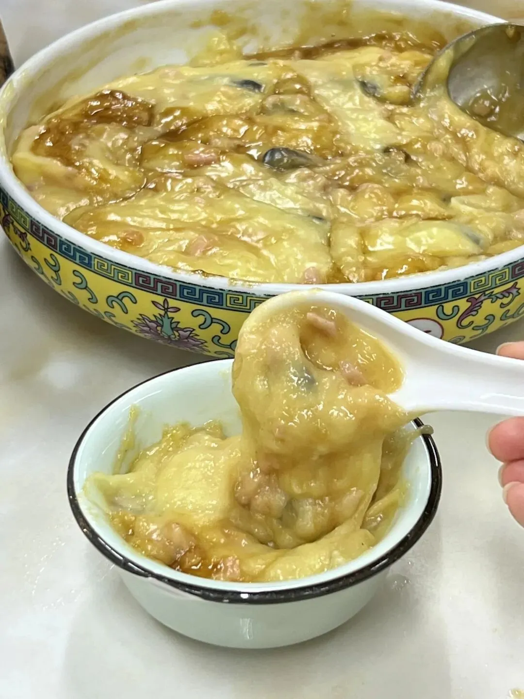 主要就是鸡蛋混了玉米面调的,再拌点切碎的木耳丁火腿丁虾米,每家店加的料都有点不一样,全看老板习惯。你看这卖相,黄灿灿稠乎乎的,舀一勺都拉黏,看着就香。