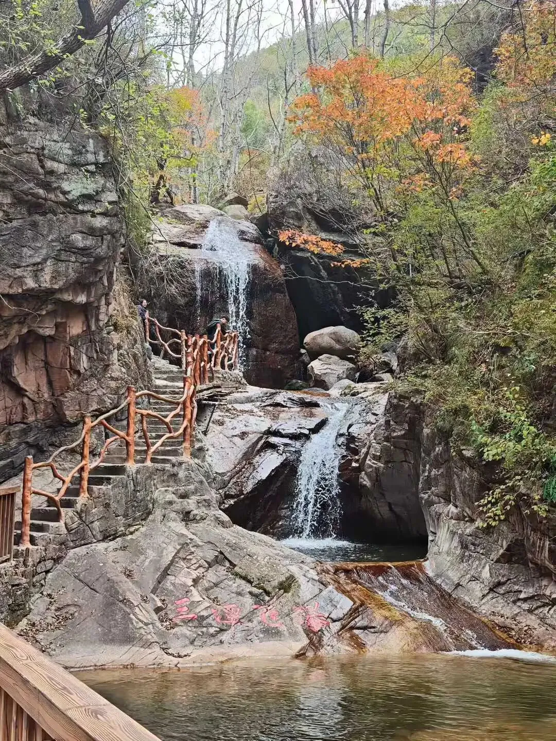 下山走百瀑峡,这边的瀑布更多、更密,一路都是水景。水流更缓,潭水也更深,碧绿碧绿的像翡翠。山路相对平缓,走起来比上山轻松不少,边走边看风景,不知不觉就到山脚下了。