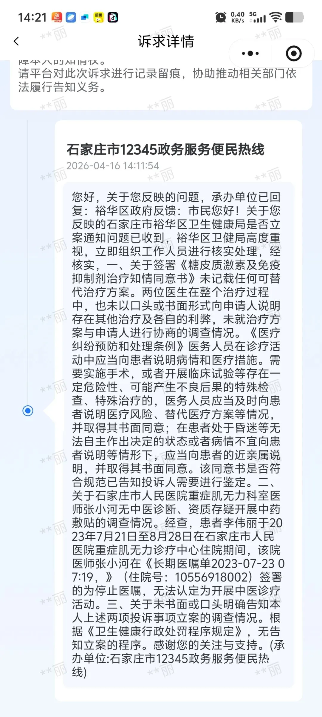 2026年4月16日,我收到石家庄市12345政务服务便民热线反馈,裕华区卫生健康局对我投诉1.《关于要求对石家庄市人民医院及涉事医生郭学通,乞国艳未履行替代医疗方案告知义务进行行政处罚的履职申请书》2.《对石家庄市人民医院重症肌无力科室医师张小河无中医诊断,资质存疑开展中药敷贴的行政追责申请书》作出“回应”。