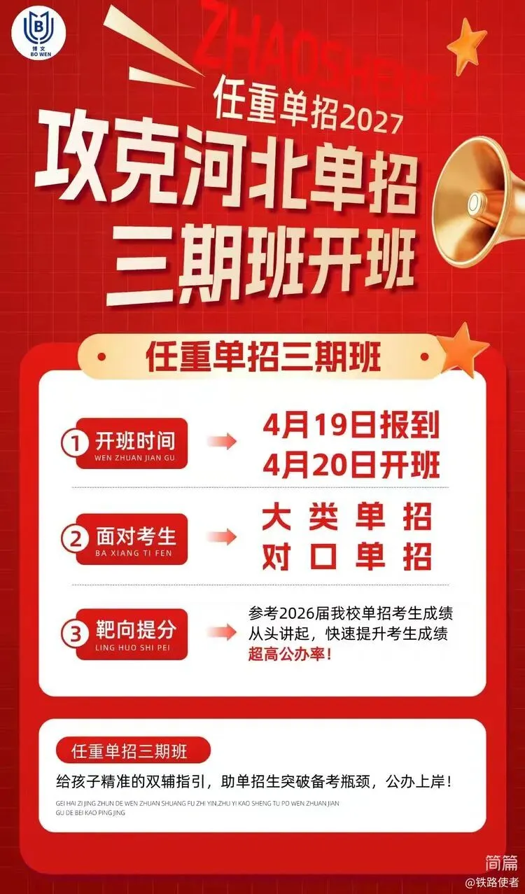 石家庄任重博文学校2027年单招三期班将于2026年4月19日正式开课,现面向计划参加2027年河北单招的学生开启预报名。预报名期间缴纳1000元可抵扣2000元学费,为备考之路减轻经济负担。学校随时欢迎学生及家长到校参观,实地了解教学环境与设施。