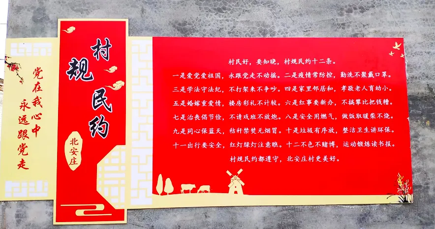 厚植文明乡风,筑牢乡村文明根基。村党支部发挥战斗堡垒作用,成立红白理事会并制定章程,全程监督“婚事新办、丧事简办”,推动每户红白事平均节约近万元;编制《北安庄特色教育宣传册》常态化宣讲,建成文化、法治教育长廊普及法律知识;重新修订12条村规民约,将环境整治、门前三包纳入其中,推动爱护环境成为村民共识,村容村貌焕然一新。