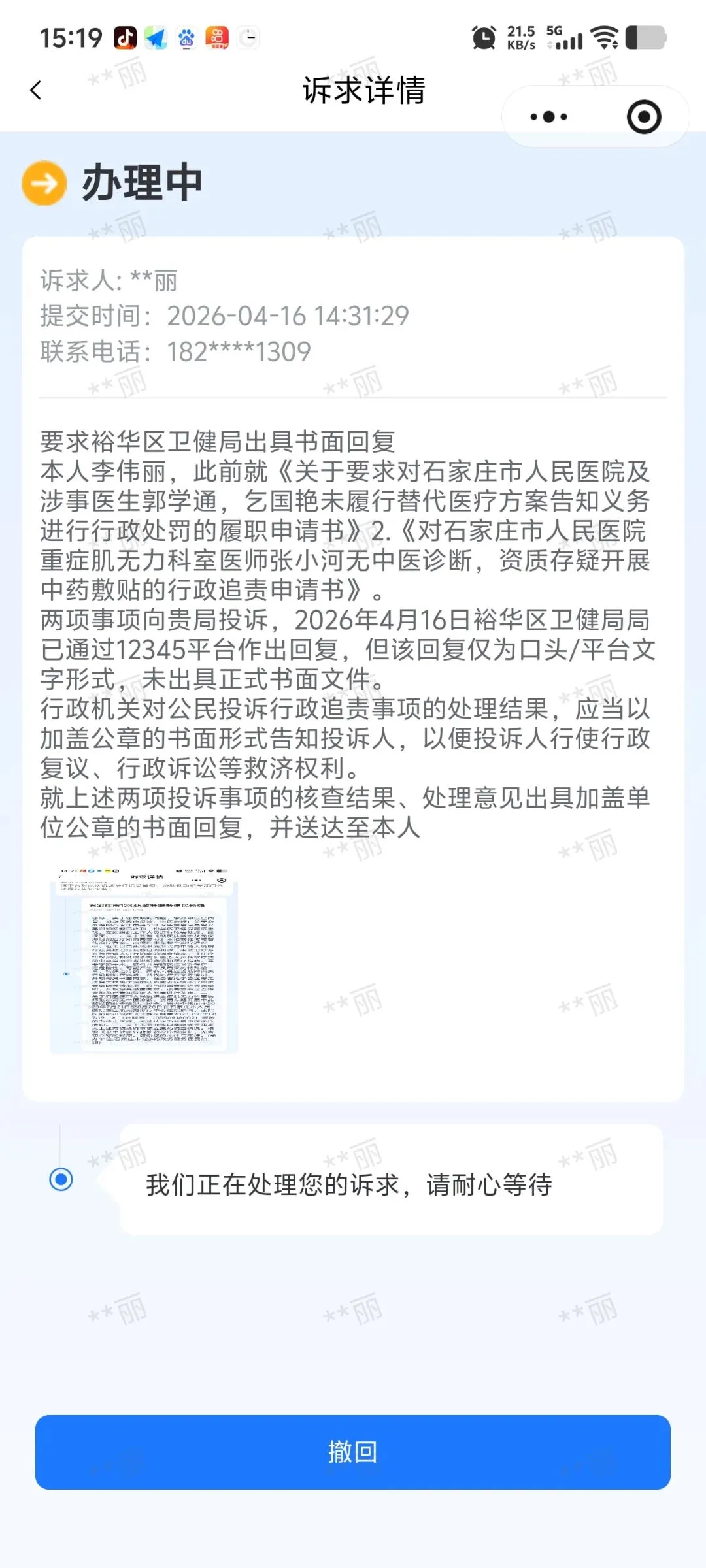 2026年4月16日,我收到石家庄市12345政务服务便民热线反馈,裕华区卫生健康局对我投诉1.《关于要求对石家庄市人民医院及涉事医生郭学通,乞国艳未履行替代医疗方案告知义务进行行政处罚的履职申请书》2.《对石家庄市人民医院重症肌无力科室医师张小河无中医诊断,资质存疑开展中药敷贴的行政追责申请书》作出“回应”。