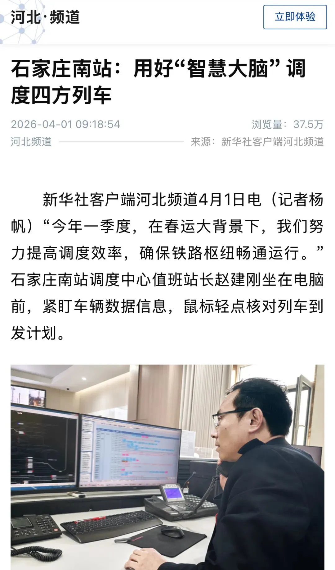 2026年4月1日,新华社客户端河北频道发表《石家庄南站:用好“智慧大脑” 调度四方列车》新闻报道一篇。内容聚焦车站调度中心“智慧大脑”的数字化升级,告别了以往手工画图作业,借助智能调度系统实现日均近2.5万辆列车的解体、编组与出发,今年一季度车站始终保持路网车流高位运转,保障京广、石德、石太等干线畅通。