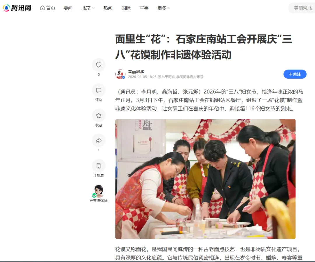 2026年3月5日,在腾讯网美丽河北发表《面里生“花”:石家庄南站工会开展庆“三八”花馍制作非遗体验活动》新闻报道一篇。内容为车站工会举办庆“三八”花馍制作非遗体验活动,邀请女职工亲手捏制传统花馍,在指尖技艺中感受节日温暖与非遗魅力。