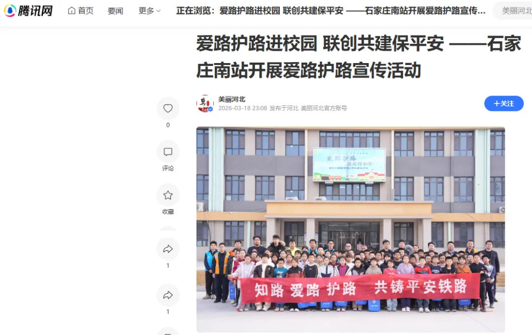 2026年3月18日,在腾讯网美丽河北发表《爱路护路进校园 联创共建保平安——石家庄南站开展爱路护路宣传活动》图片新闻一篇。内容为车站深入校园开展爱路护路宣传,通过案例讲解与互动问答,为师生送上铁路安全知识,筑牢路外安全防线。