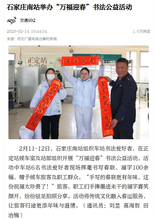 2026年2月14日,在河北交通广播交通992发表《石家庄南站举办“万福迎春”书法公益活动》新闻报道一篇。内容为车站开展“万福迎春”书法公益活动,书法特长职工为旅客写春联送祝福。