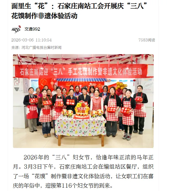 2026年3月6日,在河北交通广播交通992发表《面里生“花”:石家庄南站工会开展庆“三八”花馍制作非遗体验活动》报道一篇。