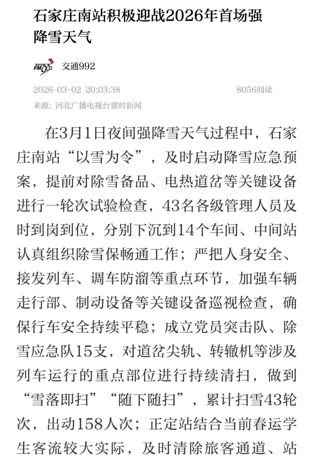 2026年3月2日,在河北交通广播交通992刊登《石家庄南站积极迎战2026年首场强降雪天气》报道。内容为面对2026年石家庄首场强降雪,车站职工以雪为令迅速到岗,连夜清扫道岔积雪,全力保障运输畅通有序。
