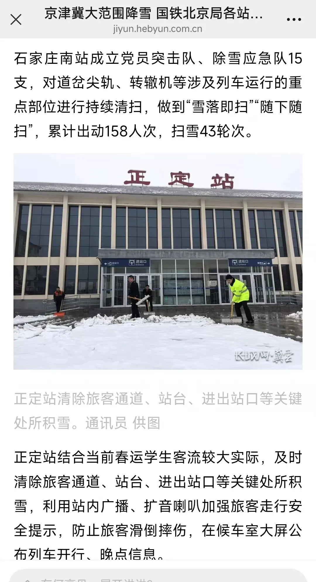2026年3月2日,在冀云新媒体平台发表《京津冀大范围降雪 国铁北京局各站点除雪“总动员”》新闻报道一篇。内容为北京局应对降雪工作中,车站职工坚守一线除雪保畅,展现铁路人的责任与担当。