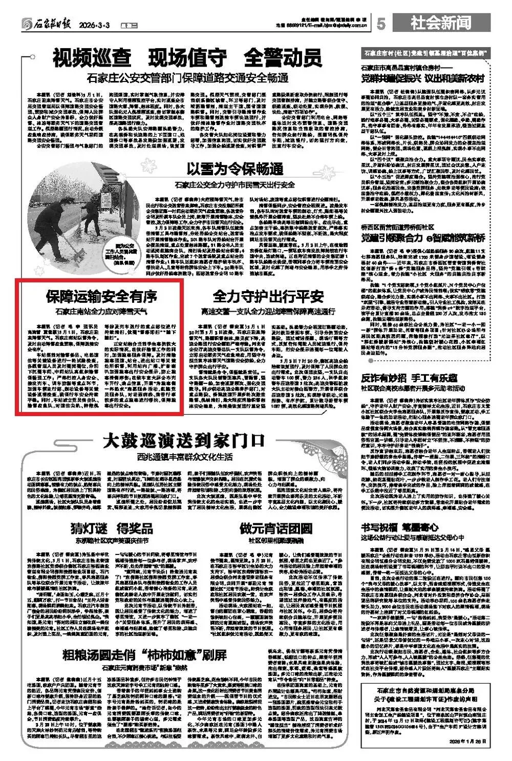 2026年3月3日,在石家庄日报第五版社会新闻发表《保障运输安全有序 石家庄南站全力应对降雪天气》报道一篇。内容为车站干部职工以雪为令,连夜奋战除雪,全力保障运输畅通。