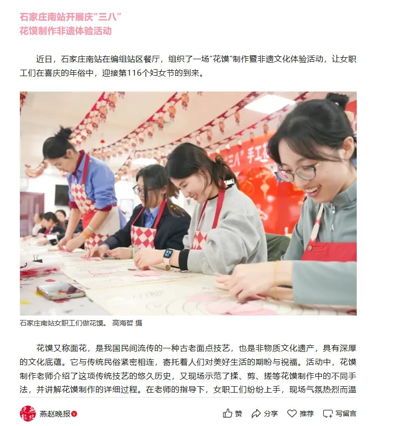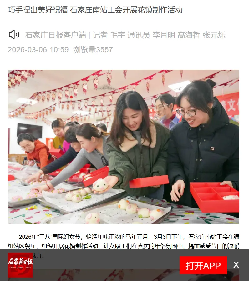 2026年3月6日,在石家庄日报发表《巧手捏出美好祝福 石家庄南站工会开展花馍制作活动》图片新闻一篇。通过报道车站女工非遗花馍制作体验活动传递节日美好祝福。