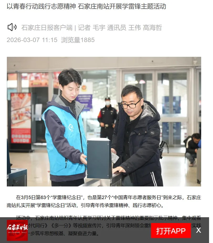 2026年3月7日,在石家庄日报发表《以青春行动践行志愿精神 石家庄南站开展学雷锋主题活动》图片新闻一篇。内容为车站团委组织青年职工以志愿服务实际行动传承雷锋精神,展现新时代铁路青年的责任与担当。