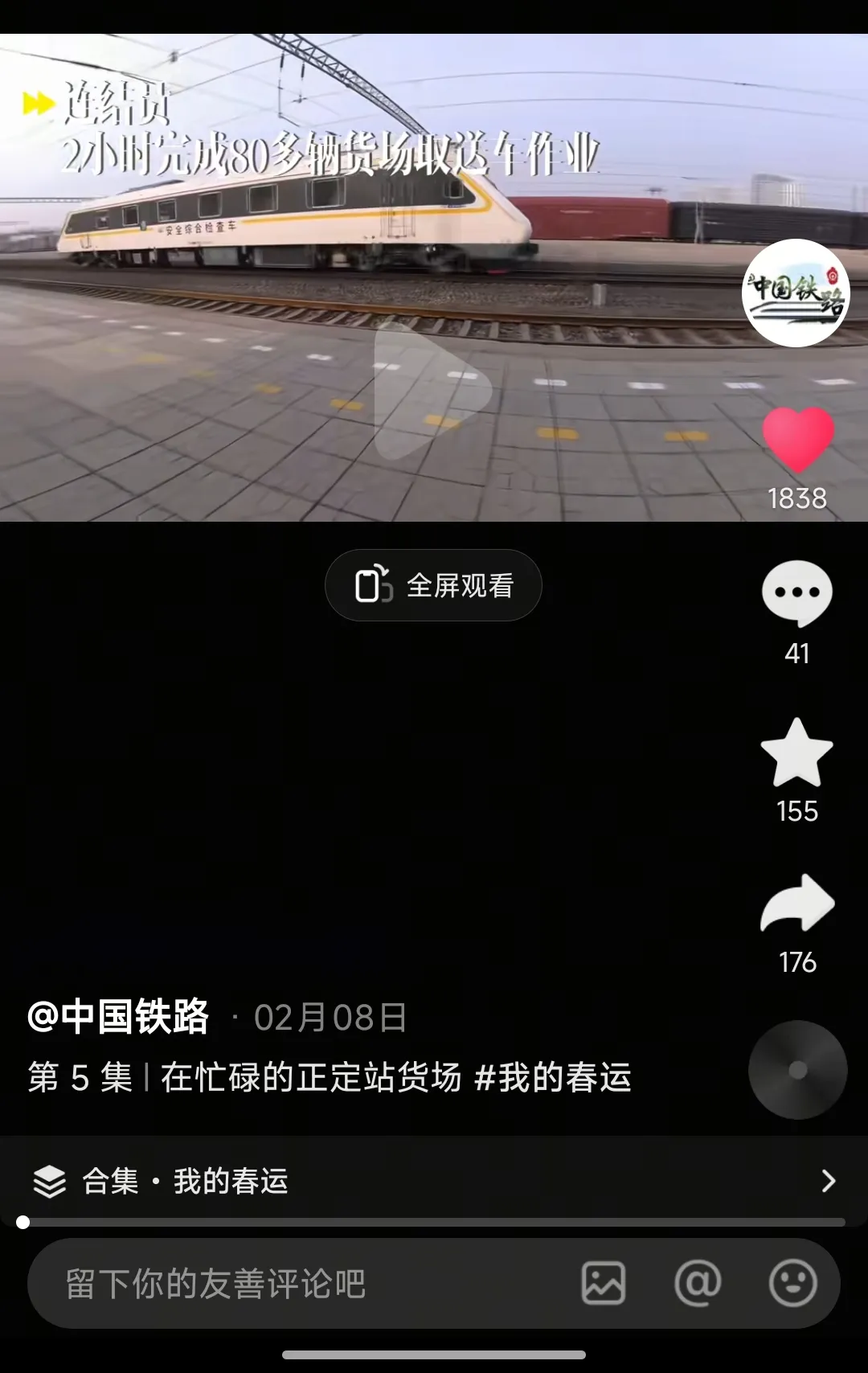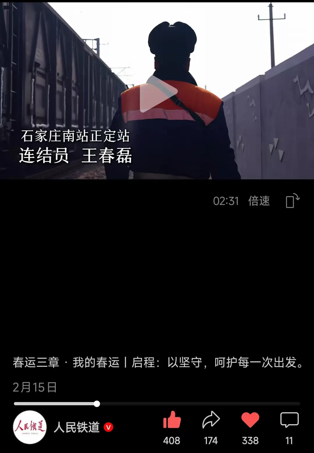 2026年2月15日,人民铁道视频号推送短视频《我的春运 连结员春运坚守作业》。内容为聚焦连结员春运坚守,展现调车作业中每一个标准动作背后的安全守护。