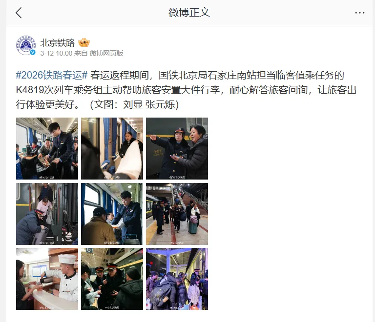 2026年3月12日,北京铁路微博推送图文消息《石家庄南站用心值乘K4819次临客,让旅客出行体验更美好》。通过一组帮扶旅客的新闻图片展现车站临客值乘人员悉心服务旅客的担当。