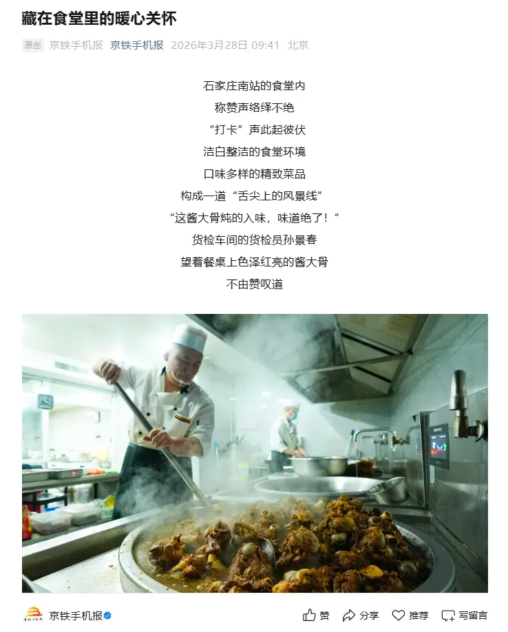 2026年3月28日,在京铁手机报发表《藏在食堂里的暖心关怀》图文专刊一篇。内容聚焦车站食堂餐饮品质提升改善,展现车站对职工的关心关爱。