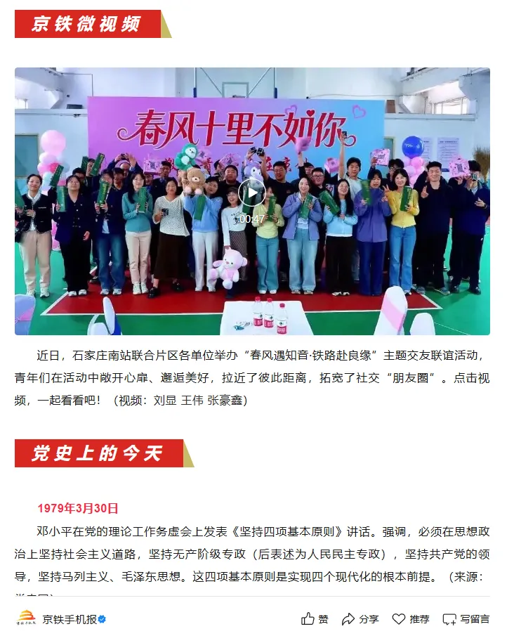 2026年3月30日,京铁手机报刊登《石家庄南站联合片区开展交友联谊》短视频。内容为车站团委积极搭建平台服务青年婚恋交友。