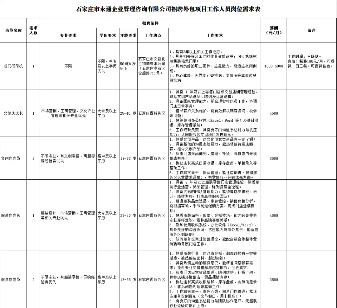 (二)薪酬及福利见需求表,缴纳五险。三、招聘基本要求(一)遵守宪法和法律,具有良好的品行和职业道德;(二)具有与招聘岗位要求相适应的年龄、学历、专业和技能等条件;(三)符合岗位所要求的身体条件和心理素质,需身体健康。四、不得报名情形(一)曾因违法行为,被给予行政拘留、强制戒毒等限制人身自由的治安行政处罚的;(二)曾受过刑事处罚或涉嫌违法犯罪尚未查清的;(三)曾被开除党、团籍的;(四)因违纪违规被开除、辞退、解聘的;(五)参加非法组织、邪教组织或从事其他危害国家安全活动的;(六)有较为严重的个人不良信用记录的;(七)其他不适宜从事所报岗位要求的。五、工作地点鹿泉区大河镇石家庄国际农产品批发交易中心六、用工方式外包形式七、招聘程序(一)网上报名及资格初审1.网上报名报名时间:2026年4月16日-招满为止。报名邮箱:ytwy12356@163.com联系人:康先生请有意向者将简历(包含报名岗位)及材料扫描件打包发送至以上邮箱,邮件命名方式为:“姓名+岗位”材料包括但不限于:本人简历、身份证、毕业证、资格证书等能够证明自己符合岗位条件的材料。每名应聘者限报考一个岗位。本次应聘实行诚信报名机制,应聘者必须对提交审核报名信息的真实性负责。资格审核贯穿应聘工作全过程,在任何环节发现应聘者不符合应聘条件的,一经查实,立即取消应聘资格,有弄虚作假行为的要追究责任。2.资格初审资格初审标准:依据招聘岗位设置的条件进行资格审查。初审通过的应聘者将以邮箱的方式告知面试时间及地点,请应聘者实时关注邮件并按时参加。(二)面试1.面试时间、地点时间、地点、携带资料将以邮箱的形式通知应聘者,请应聘者实时关注邮件并按时参加。2.面试方式和内容具体面试方式和内容以邮件形式通知。3.确定进入体检人员依据参加面试者所报岗位的人数需求,按照应聘者面试成绩由高到低进行排名,确定进入体检环节人员名单。(三)体检体检时间及体检项目标准以邮箱形式通知,请应聘者实时关注邮件并按时参加。体检人员需符合入职体检要求,体检合格的,进行下一环节。体检不合格的,取消拟录用人选资格。体检费用自理。(四)人员录用1.体检合格的拟录用人员,按规定与第三方签订相关协议,办理录用手续。2.在办理录用手续期间,不在规定时间报到的,取消其录用资格。注意事项:1、请应聘者及时关注邮件通知,凡未在规定时间内参加招聘程序的视为自动放弃。2、本次公开招聘外包人员工作由石家庄永通企业管理咨询有限公司统一组织实施。咨询电话:15511884190(工作日9:00-11:30 13:00-17:00)来源:https://www.sjzhr.com/newsDetail?id=2044594114073792513