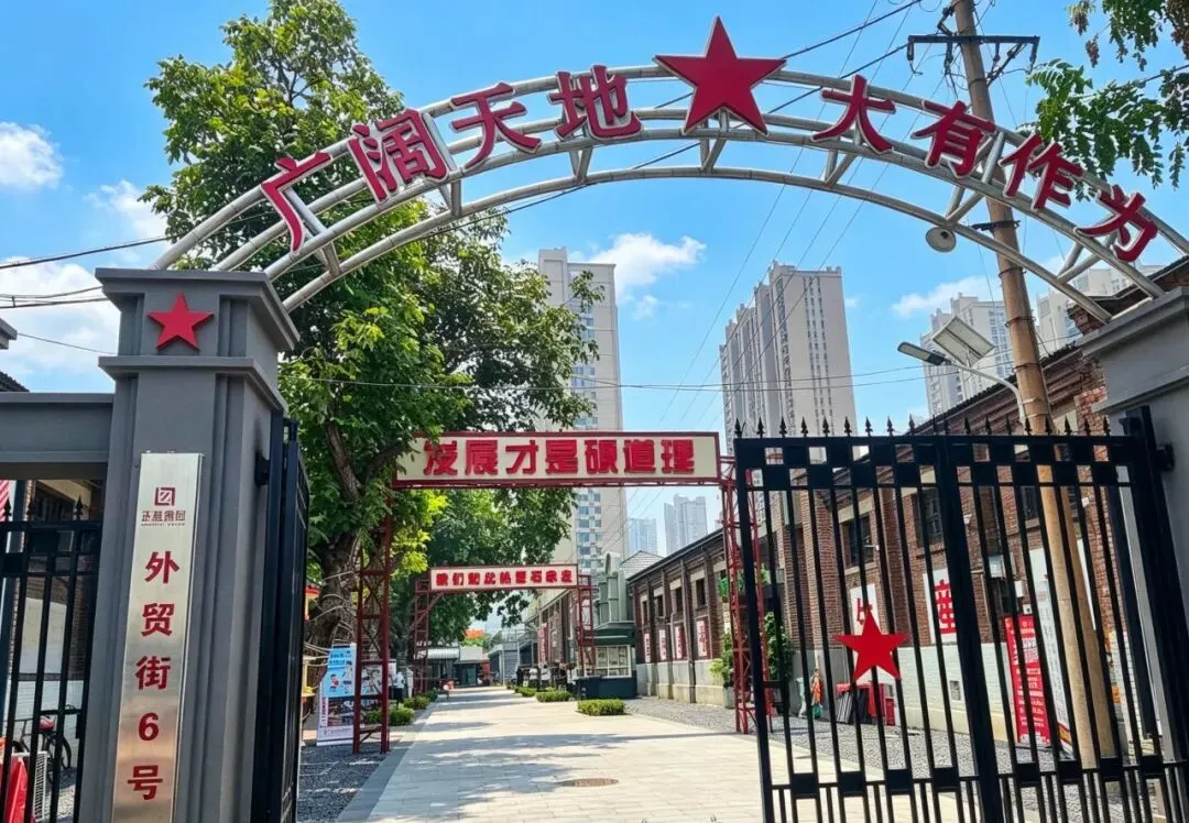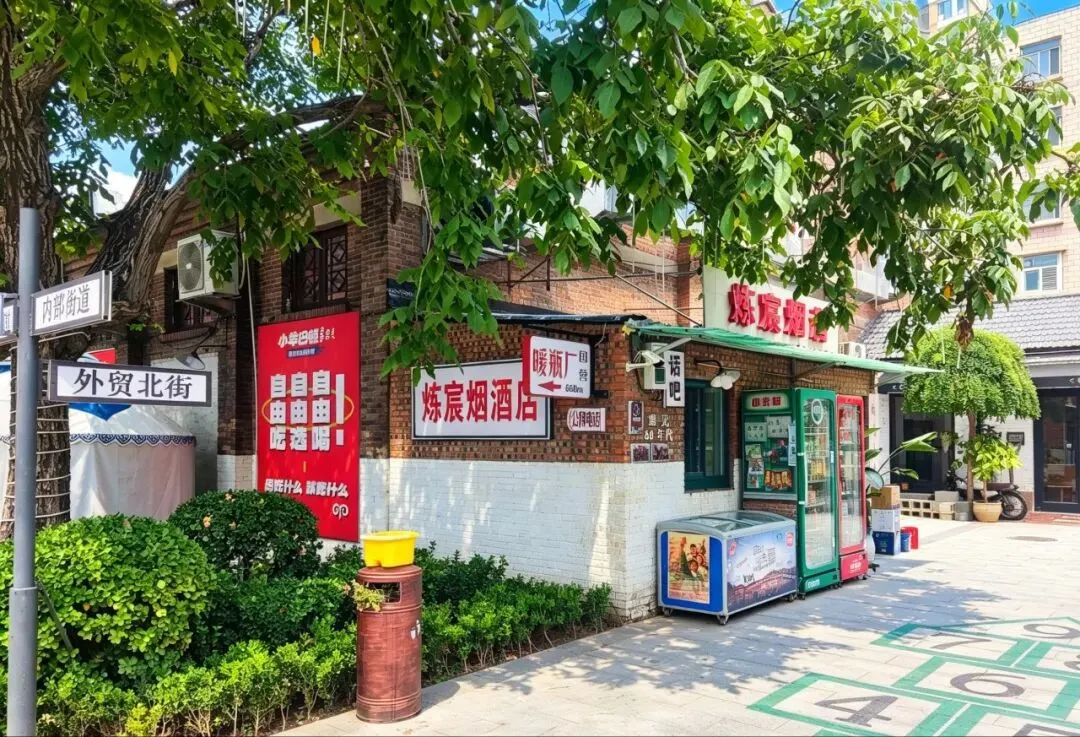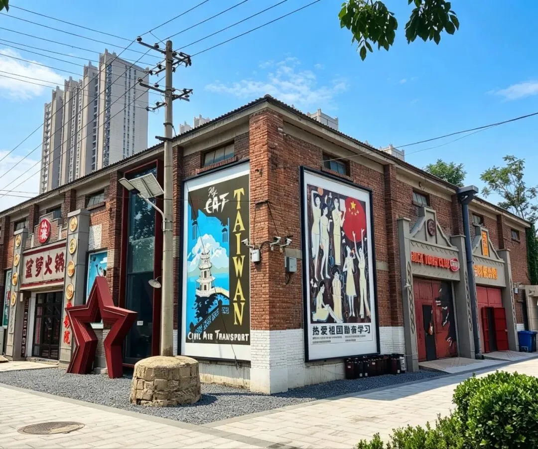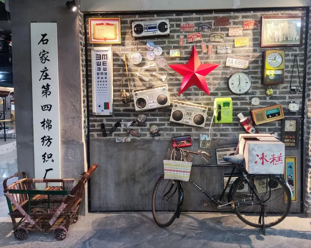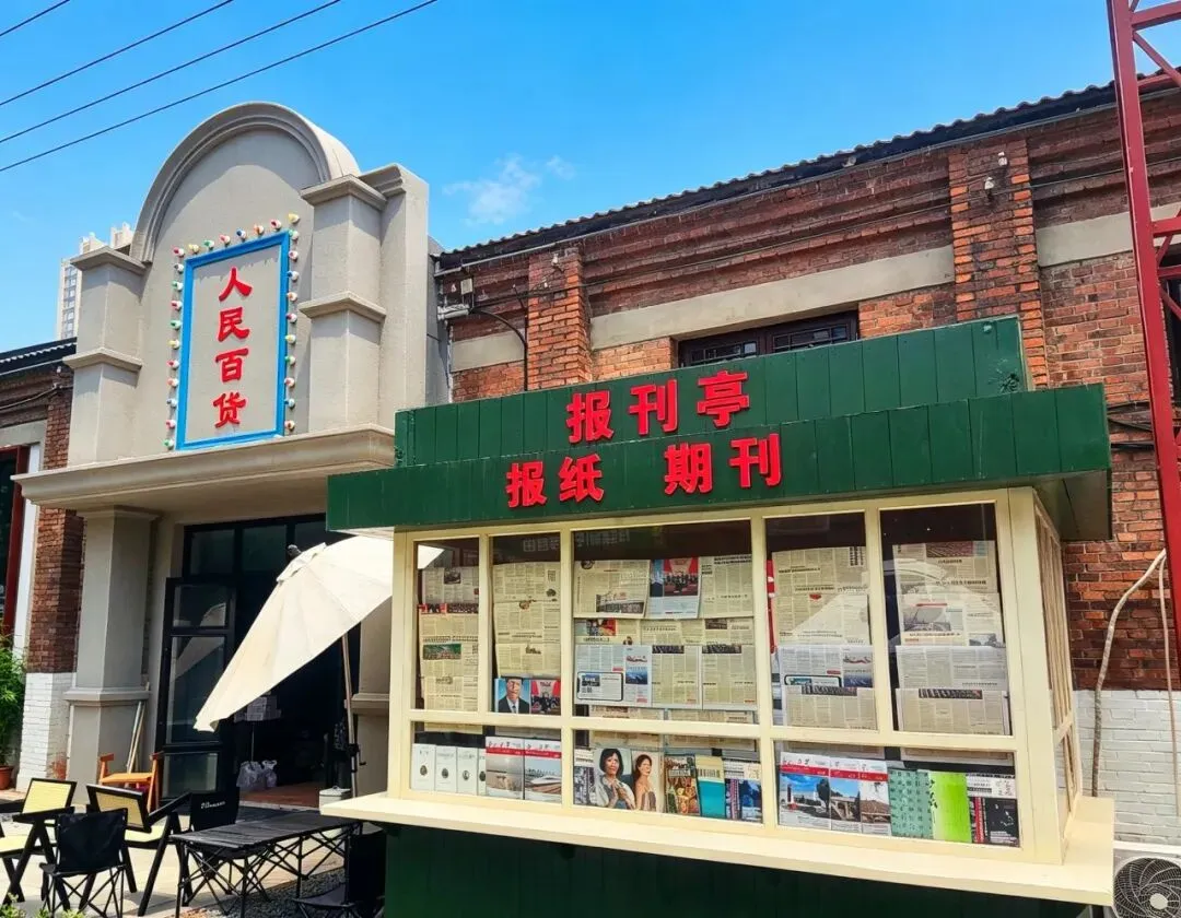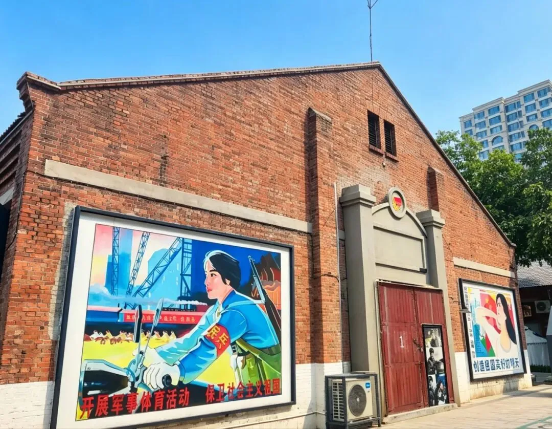 园区原址为石家庄棉纺厂老仓库,是石家庄纺织工业辉煌历史的实物载体。这片老仓库曾服务于石家庄棉纺产业,见证了城市“纺织名城”的黄金时代,建筑保留了典型的工业风红砖肌理。 外贸街6号以“80年代复古市井”为核心主题,该建筑区域是主题还原的关键载体。它通过保留老厂房建筑本体,结合时代感的装饰细节,完整复刻了老石家庄的市井氛围与时代记忆,是园区“工业遗产活化”与“怀旧场景打造”的重要实践样本。经典的深绿色铁皮顶搭配米白色窗框,还原了国营报刊亭的复古造型,是80-90年代城市街头的标志性设施。橱窗内贴满报纸、杂志,完整复刻了当年报刊亭的经营场景,唤醒一代人的童年记忆。 以改造后的老棉纺仓库红砖建筑为载体,通过大型复古宣传画,完整还原了上世纪中后期的时代风貌,是园区“80年代市井怀旧”主题的标志性打卡点。 红砖胡同复原