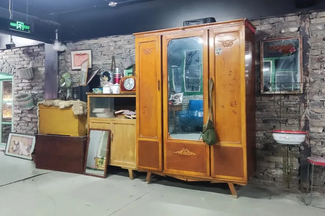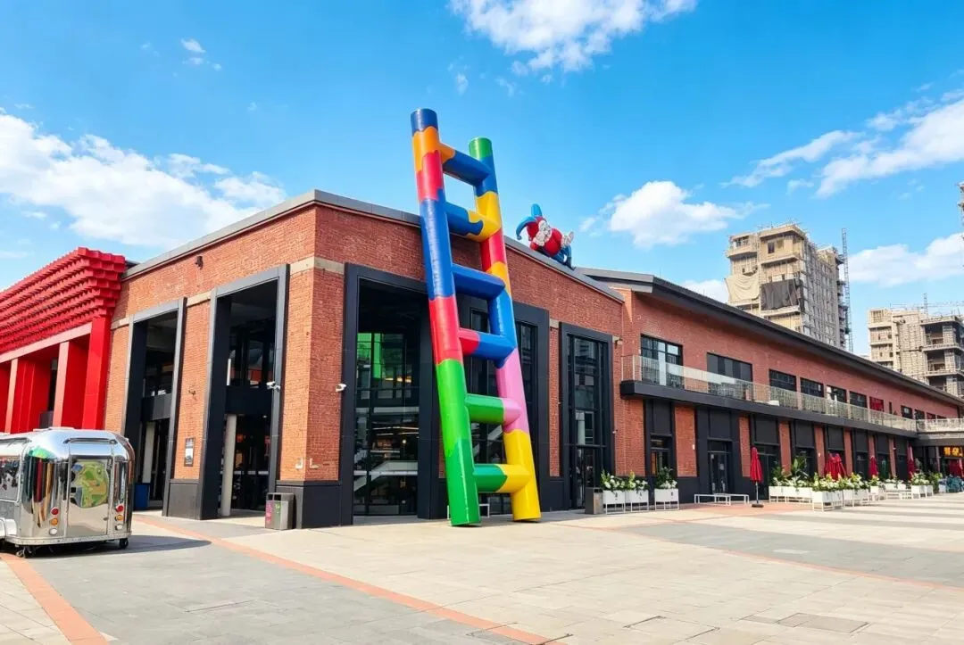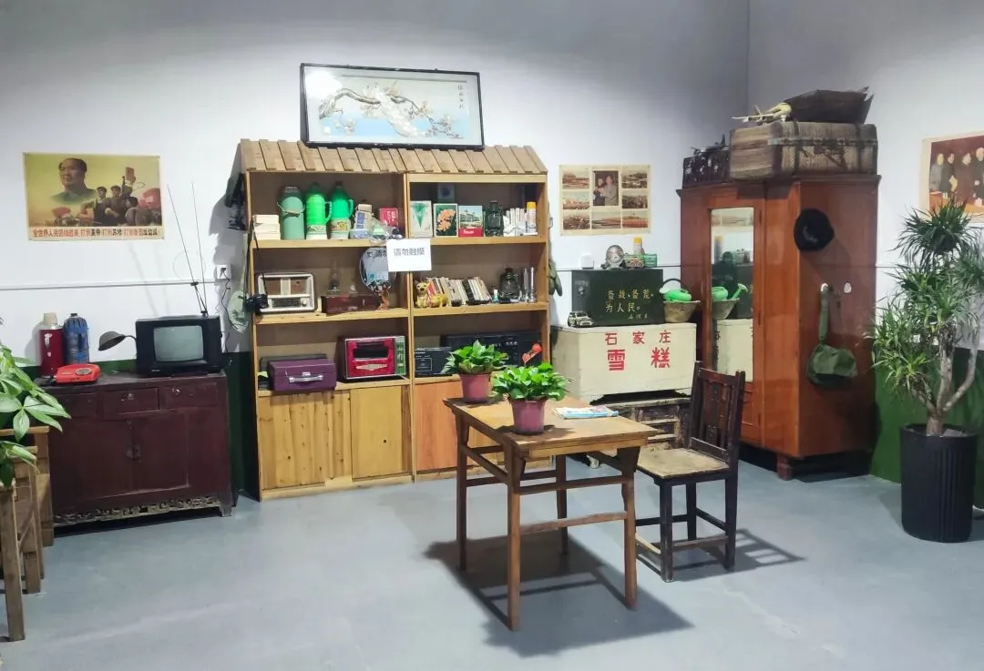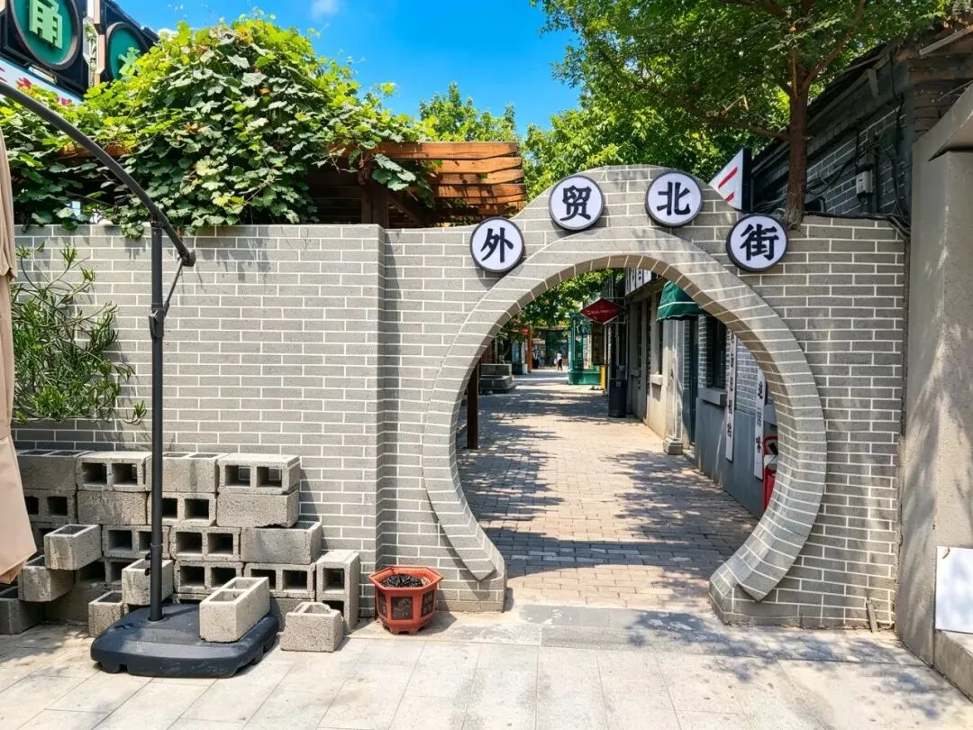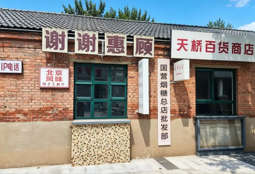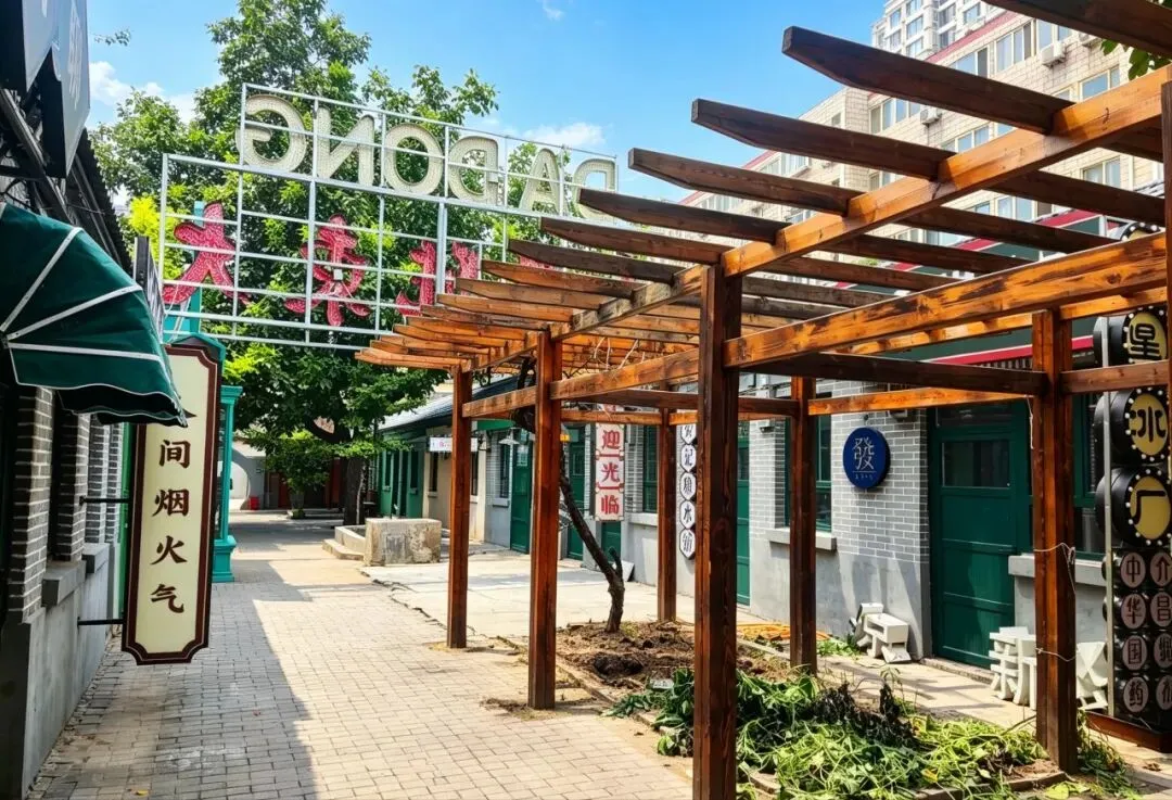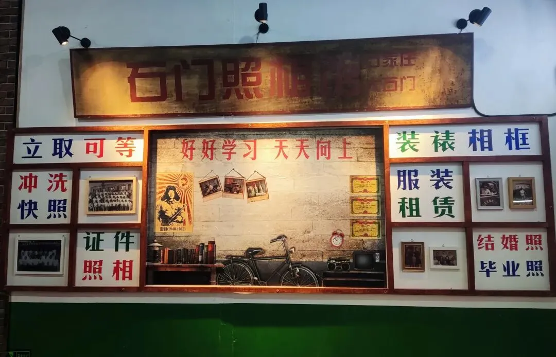 园区原址为石家庄棉纺厂老仓库,是石家庄纺织工业辉煌历史的实物载体。这片老仓库曾服务于石家庄棉纺产业,见证了城市“纺织名城”的黄金时代,建筑保留了典型的工业风红砖肌理。 外贸街6号以“80年代复古市井”为核心主题,该建筑区域是主题还原的关键载体。它通过保留老厂房建筑本体,结合时代感的装饰细节,完整复刻了老石家庄的市井氛围与时代记忆,是园区“工业遗产活化”与“怀旧场景打造”的重要实践样本。经典的深绿色铁皮顶搭配米白色窗框,还原了国营报刊亭的复古造型,是80-90年代城市街头的标志性设施。橱窗内贴满报纸、杂志,完整复刻了当年报刊亭的经营场景,唤醒一代人的童年记忆。 以改造后的老棉纺仓库红砖建筑为载体,通过大型复古宣传画,完整还原了上世纪中后期的时代风貌,是园区“80年代市井怀旧”主题的标志性打卡点。 红砖胡同复原