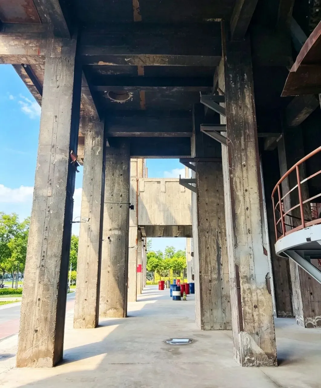 织音1953文化艺术园区,是石家庄以原国营石家庄第一、第二棉纺织厂(棉一、棉二)工业遗址为核心,打造的城市更新与工业遗产活化标杆项目,也是石家庄“纺织城”记忆的全新载体。“织”代表这里的灵魂产业纺织。石家庄曾是新中国“一五”计划期间的华北纺织中心,棉一、棉二等大厂支撑起了城市的工业辉煌;音”代表文创、音乐与艺术。园区改造后植入了音乐演出、文创市集、艺术展览等现代功能,让老厂房焕发新的文化声量;1953”这是国营石家庄第一棉纺织厂(棉一)的建厂年份。作为新中国“一五”计划的156个重点项目之一,1953年标志着石家庄纺织工业迈入现代化大生产时代,是城市历史的关键时间节点。 锯齿形造型灵感源自老棉纺厂厂房的经典锯齿形屋顶(为车间提供自然采光),用现代设计语言复刻了工业建筑的标志性元素,实现了历史与潮流的对话。完整保留了原棉纺厂车间的巨型混凝土梁柱、裸露的管道管线、锯齿形天窗,这些都是老纺织厂房的标志性结构,锯齿天窗为车间提供了充足的自然采光,是工业遗产活化的核心体现。 织音1953 极限运动滑板场